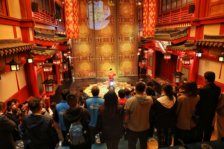 二層則是“花萼相輝·夜宴長安”主題文化宴席體驗(yàn)空間,以“唐食嗨吃、換裝推本、唐風(fēng)雅集、微縮長安、情景演藝、文化盛宴”等六大沉浸場(chǎng)為核心,大家能在長安十二時(shí)辰充分享受到“觀一場(chǎng)唐風(fēng)唐藝、聽一段唐音唐樂、演一出唐人唐劇、品一口唐食唐味、玩一回唐俗唐趣、購一次唐物唐禮”的一秒入唐體驗(yàn)。