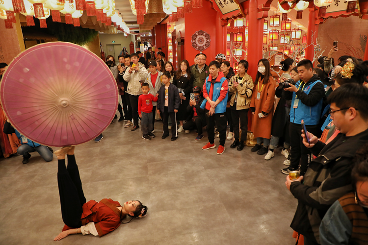 “長安十二時(shí)辰”主題街區(qū)內(nèi),NPC在街邊表演節(jié)目。
