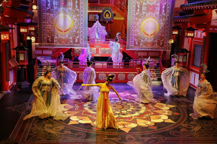 一層是以“和合之美·風(fēng)雅長安”為主題的唐風(fēng)主題互娛休閑空間,這里衣香袂影,霓裳起舞,在南北中庭公共區(qū)域的三大舞臺(tái),唐朝仕女身著飄逸襦裙,演藝霓裳羽衣舞、春江花月夜、秦王點(diǎn)兵、凌波舞、踏搖娘、公孫劍舞等特色演出,將“衣香袂影是盛唐”的場(chǎng)景完美呈現(xiàn)。