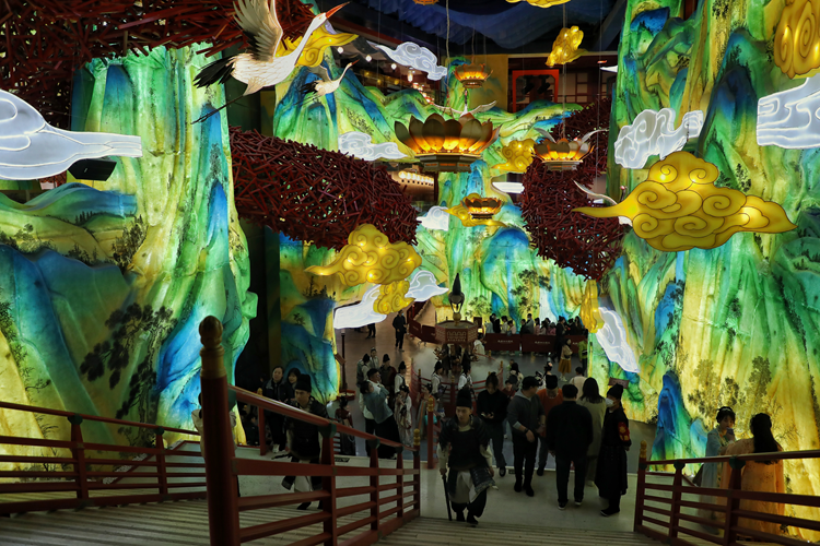 其中,南側(cè)中庭的“花舞大唐”最為出彩,場(chǎng)景布置還原《長安十二時(shí)辰》中許鶴子上元節(jié)花車斗彩巡游的場(chǎng)景,將原有兩層空中連廊巧妙利用,充分發(fā)揮三層中空的立體空間,營造一處公共演藝舞臺(tái),既符合現(xiàn)代商業(yè)公共空間設(shè)定,又營造出影視劇中燦爛奪目的舞臺(tái)效果。