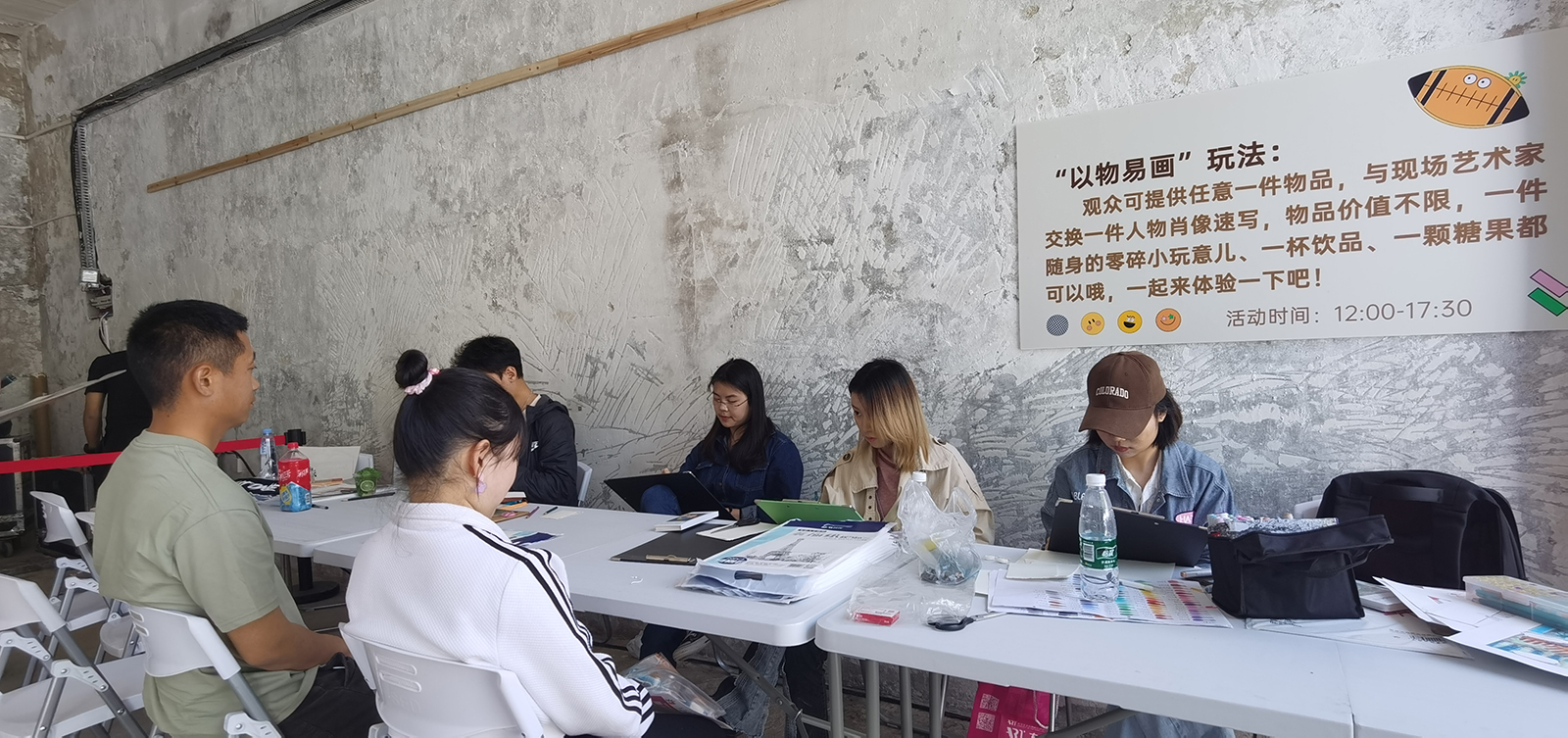 火星潮流藝術(shù)節(jié)現(xiàn)場(chǎng)發(fā)起“以物易畫(huà)”的公共藝術(shù)項(xiàng)目,觀眾可提供任意一件物品,與現(xiàn)場(chǎng)藝術(shù)家交換一件人物肖像速寫(xiě),物品價(jià)值不限,一件隨身的零碎小玩意兒、一杯飲品、一顆糖果都可以哦,一起來(lái)體驗(yàn)一下吧!