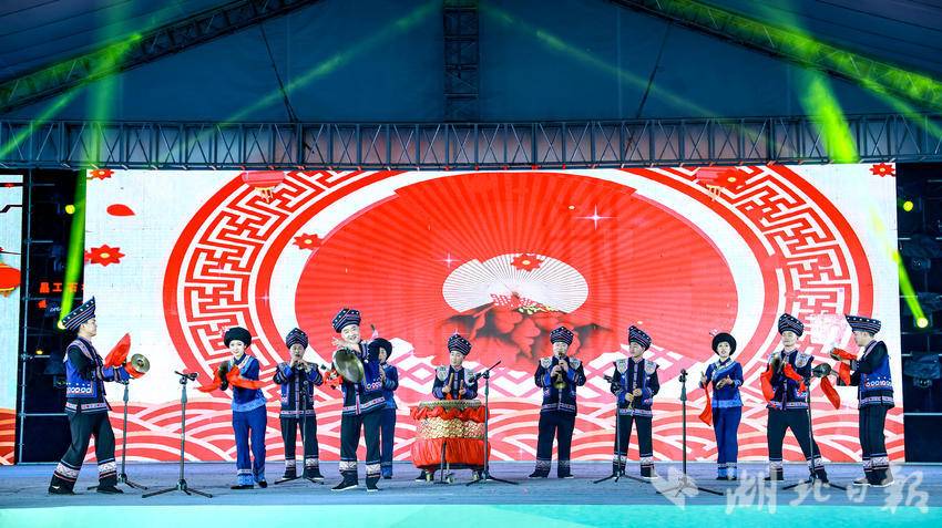 恩施花鑼鼓于2009年入選恩施州第二批州級(jí)非遺代表性項(xiàng)目名錄,由恩施土家女兒城非遺傳承展示基地表演的《秋彩》,取材于流行于恩施地區(qū)的《下水船》《八哥洗澡》《秋彩》《節(jié)節(jié)高》《四門(mén)慶》等傳統(tǒng)曲牌,是各代表性傳承人、民間藝人以及土家女兒城非遺基地青年演員們通過(guò)田野采風(fēng)、收集整理,進(jìn)行了修改和再創(chuàng)作。曲風(fēng)熱情奔放,歡快熱烈,富有濃郁的恩施地方特色,描繪了一幅勞動(dòng)人民建設(shè)和美家園、投身鄉(xiāng)村振興的美麗畫(huà)卷,其旋律剛?cè)岵?jì),抒發(fā)了鄉(xiāng)親們歡欣自豪的心情。