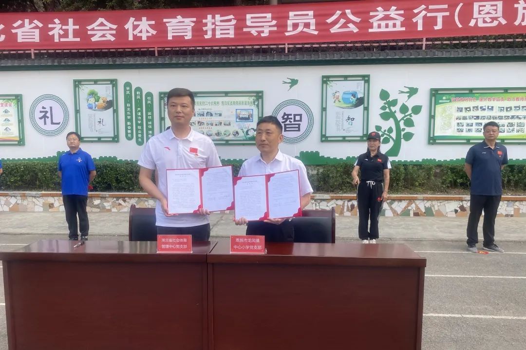 啟動(dòng)儀式中省社體中心與龍鳳鎮(zhèn)中心小學(xué)簽訂了黨建結(jié)對(duì)共建協(xié)議,對(duì)健身點(diǎn)黨員志愿服務(wù)隊(duì)授旗;為龍鳳鎮(zhèn)中心小學(xué)捐贈(zèng)足球、籃球、運(yùn)動(dòng)水杯等體育器材;省健身舞協(xié)會(huì)派出的優(yōu)秀指導(dǎo)員對(duì)學(xué)生進(jìn)行曳步舞現(xiàn)場(chǎng)指導(dǎo)教學(xué)。