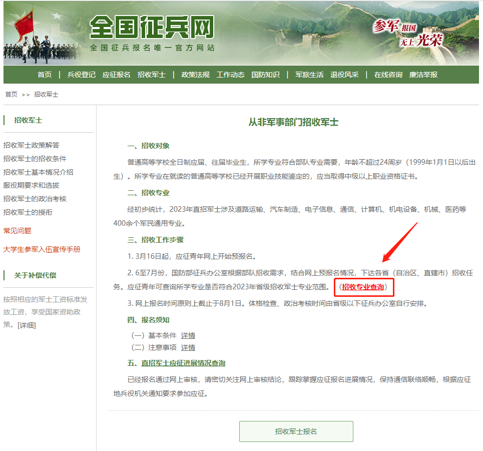招收專(zhuān)業(yè)在直招軍士預(yù)報(bào)名時(shí)可以在全國(guó)征兵網(wǎng)進(jìn)行查詢(xún)。