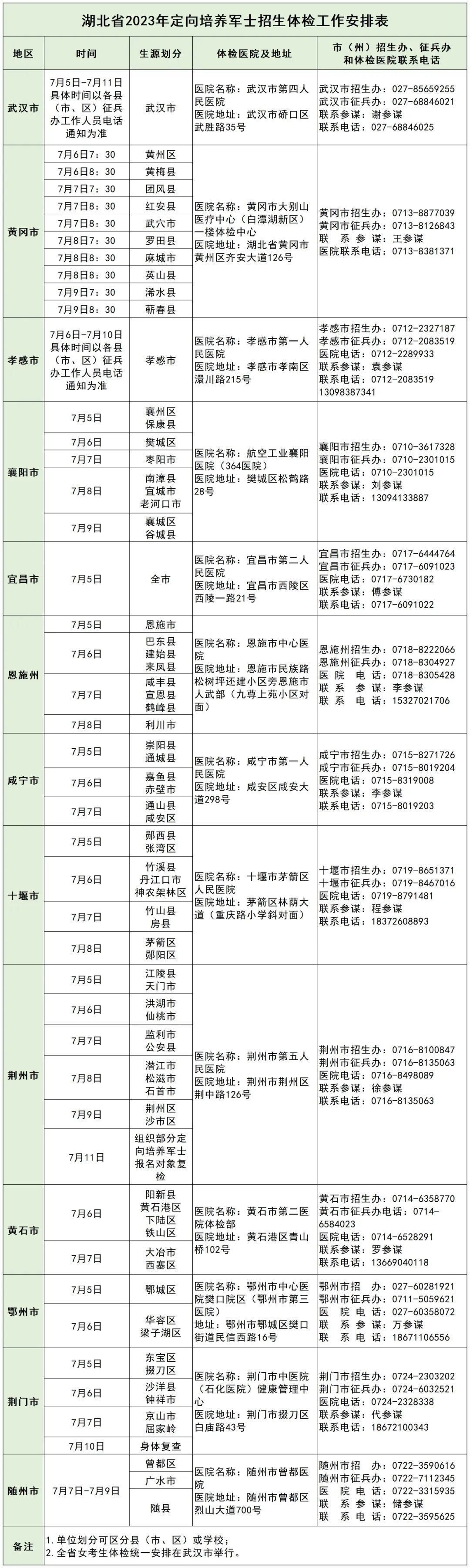 男考生體檢由生源地市(州)征兵辦集中組織實(shí)施,女考生體檢由武漢市征兵辦集中組織實(shí)施。