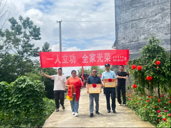 一人立功,全家光榮。現(xiàn)場,送喜報的工作人員為張森華和家人佩戴光榮綬帶戴上大紅花、送上立功喜報。“老公,你是我們一家的驕傲,以后你守護國家,我守護小家,我是你最堅強的后盾。”新婚妻子吳睆高興的說道。