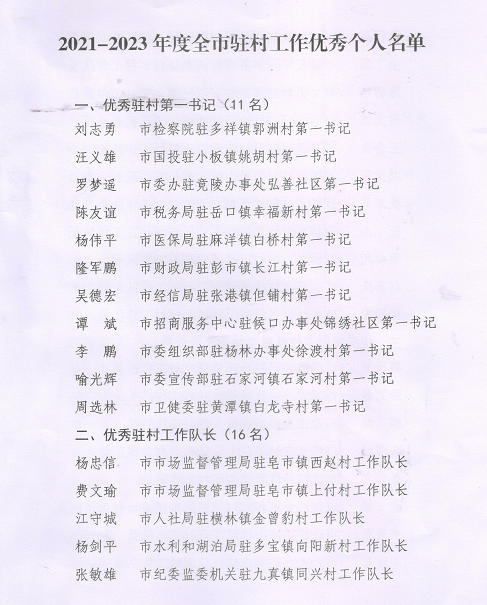 據(jù)悉,為表揚(yáng)先進(jìn)、弘揚(yáng)正氣,激勵(lì)廣大駐村第一書記、駐村工作隊(duì)長和工作隊(duì)員在鄉(xiāng)村振興一線奮勇爭(zhēng)先、建功立業(yè),奮力開創(chuàng)天門市駐村幫扶工作新局面,天門市委組織部、市鄉(xiāng)村振興局聯(lián)合開展2021-2023年度駐村工作優(yōu)秀個(gè)人評(píng)選工作。經(jīng)市級(jí)統(tǒng)一考核、鄉(xiāng)鎮(zhèn)民主推薦、市級(jí)嚴(yán)格評(píng)審,劉志勇等11名駐村第一書記、楊忠信等16名工作隊(duì)長、魏慶軍等28名駐村工作隊(duì)員被評(píng)為“2021-2023年度駐村工作優(yōu)秀個(gè)人”。