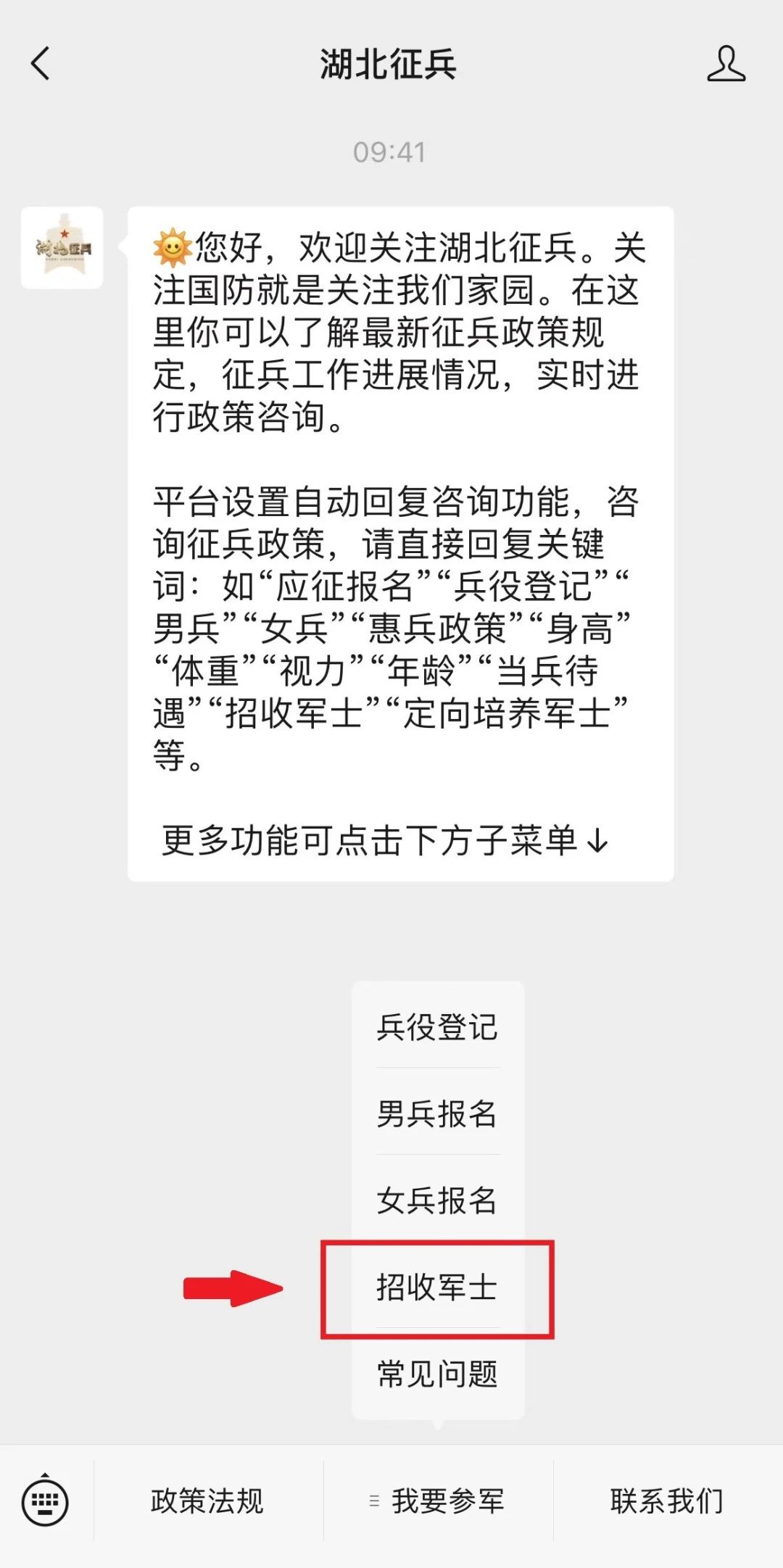 也可以關(guān)注“湖北征兵”,點(diǎn)擊子菜單“我要參軍”→“招收軍士”進(jìn)行網(wǎng)上報(bào)名。