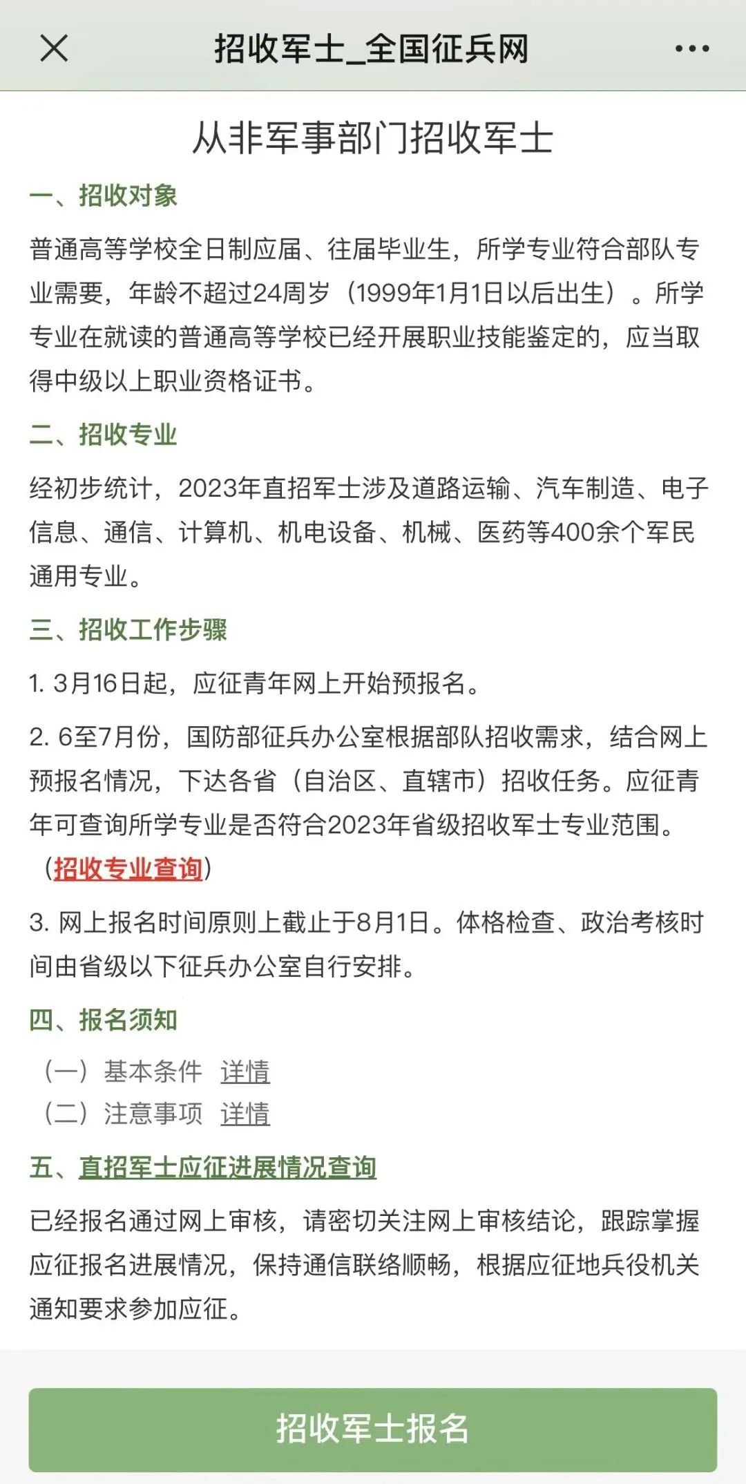 荊楚網(wǎng)(湖北日?qǐng)?bào)網(wǎng))訊(記者 黃騰)2023年全國(guó)從普通高等學(xué)校畢業(yè)生中直接招收軍士(簡(jiǎn)稱直招軍士)正在火熱報(bào)名中,網(wǎng)上報(bào)名時(shí)間原則上截止于8月1日。