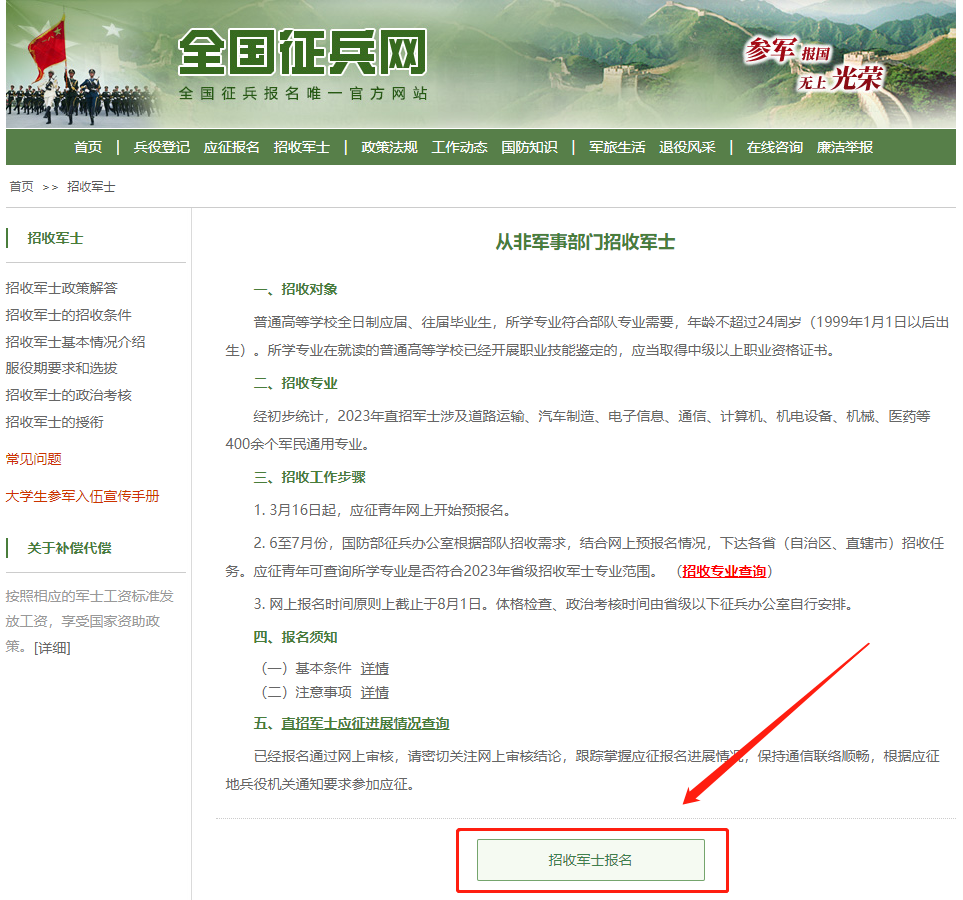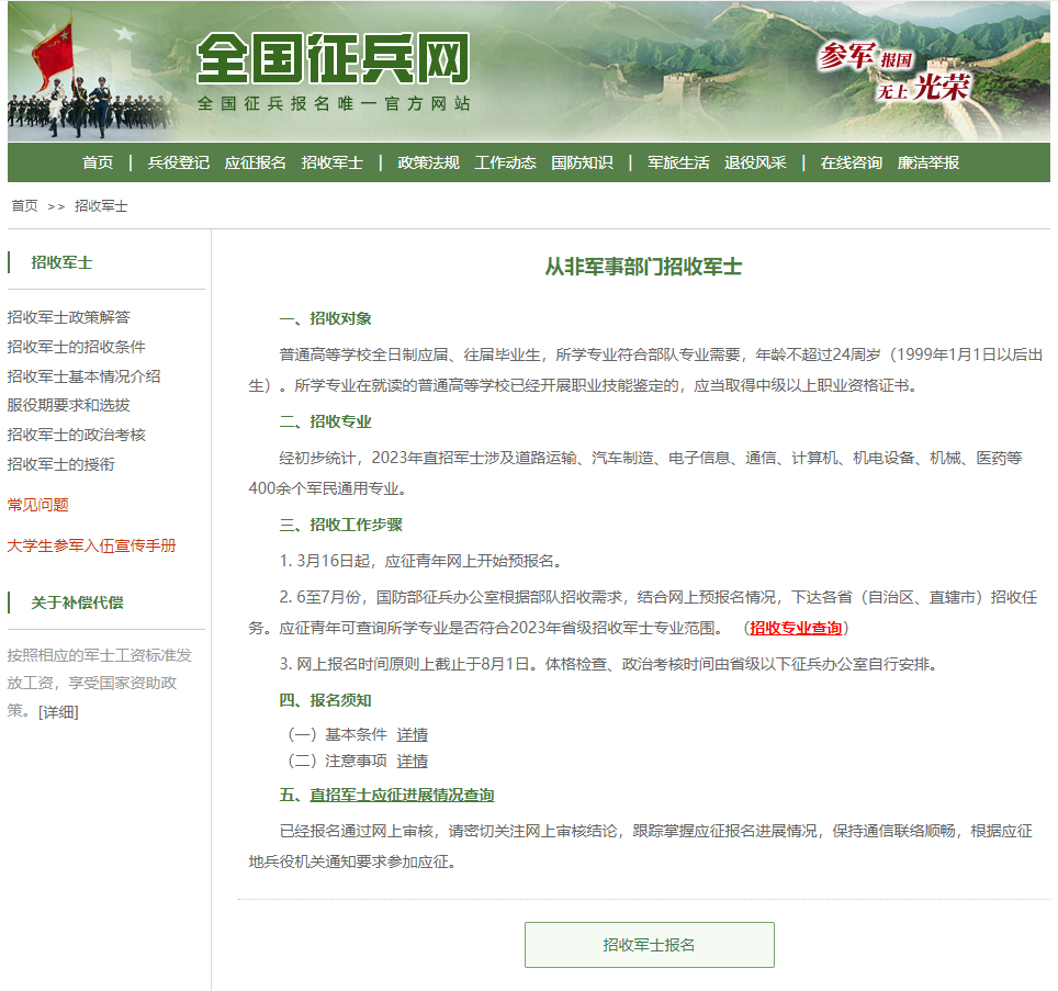 采取網(wǎng)上報(bào)名的方式,應(yīng)征青年登錄“全國(guó)征兵網(wǎng)”,點(diǎn)擊“招收軍士報(bào)名”查詢招收專業(yè)并進(jìn)行報(bào)名。