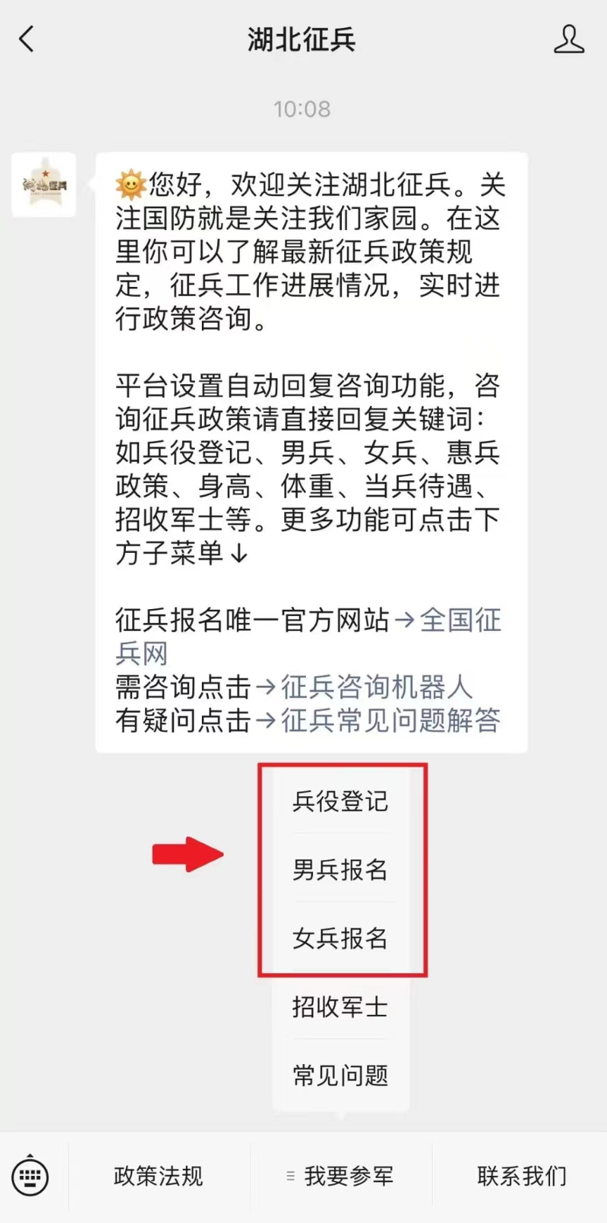 關注“湖北征兵”公眾號,點擊菜單欄“我要參軍”,直通報名頁面。