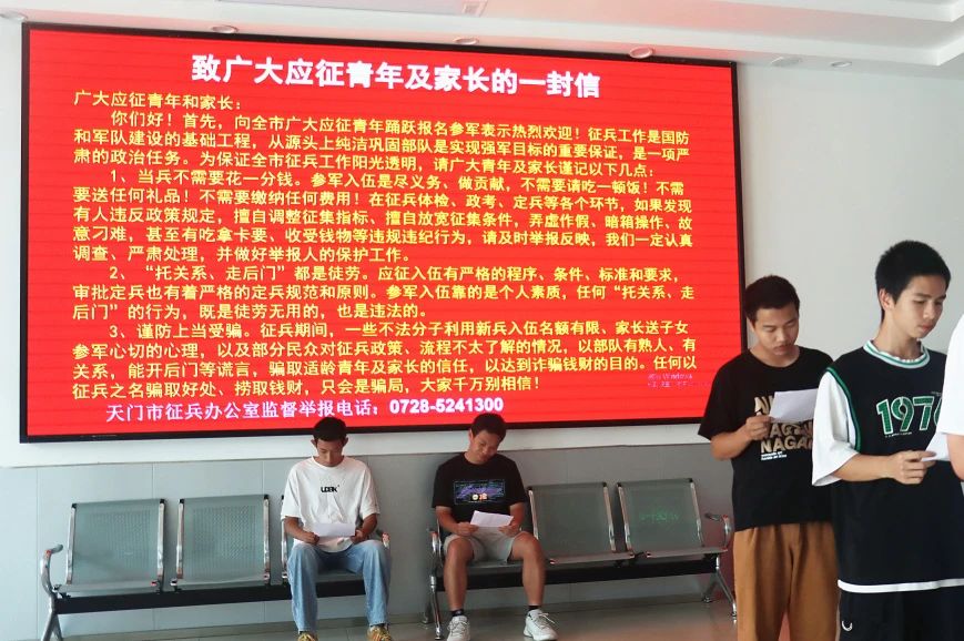 走進(jìn)體檢大廳,一封致應(yīng)征青年及家長的廉潔征兵公開信,在LED大屏幕上醒目顯示。此前,天門市人武部也通過媒體平臺(tái),廣泛宣傳廉潔征兵政策規(guī)定,為做到重點(diǎn)人群應(yīng)知盡知、全員覆蓋,天門市人武部將公開信寫在了征兵體檢現(xiàn)場,以更醒目的方式提示應(yīng)征青年及家長嚴(yán)防征兵詐騙,嚴(yán)守征兵紀(jì)律。