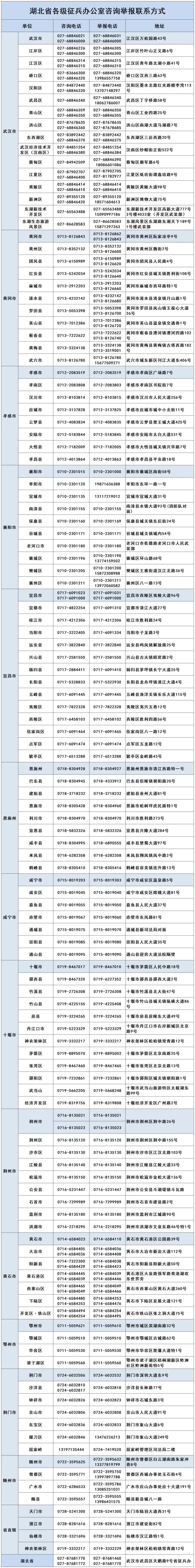 湖北省各級(jí)征兵辦公室咨詢舉報(bào)聯(lián)系方式: