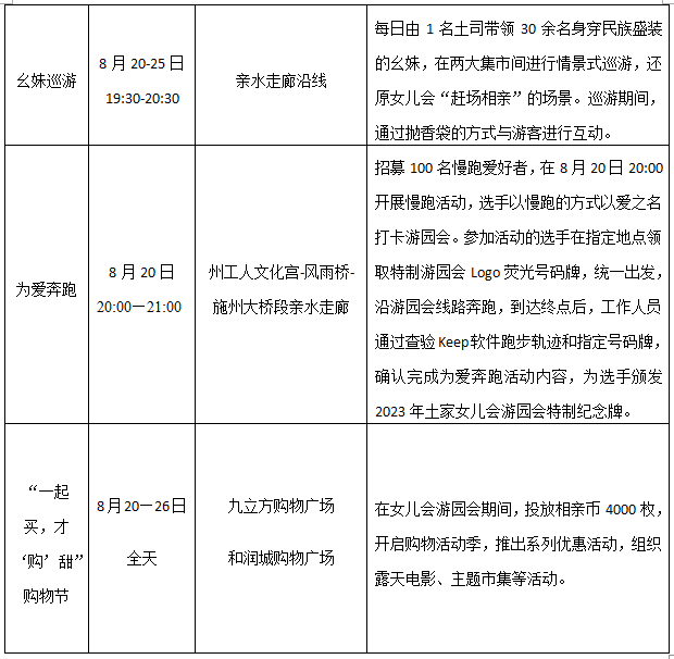 活動(dòng)地點(diǎn):三立時(shí)代廣場(chǎng)至風(fēng)雨橋親水走廊沿線(xiàn)、風(fēng)雨橋廣場(chǎng)、鳳凰山森林公園廣場(chǎng)