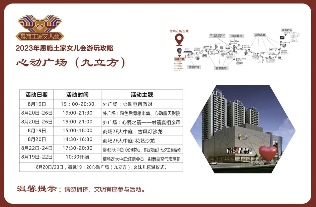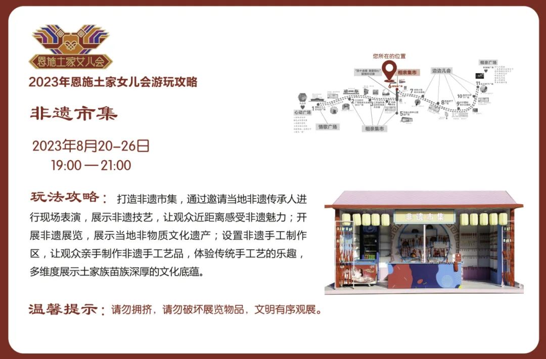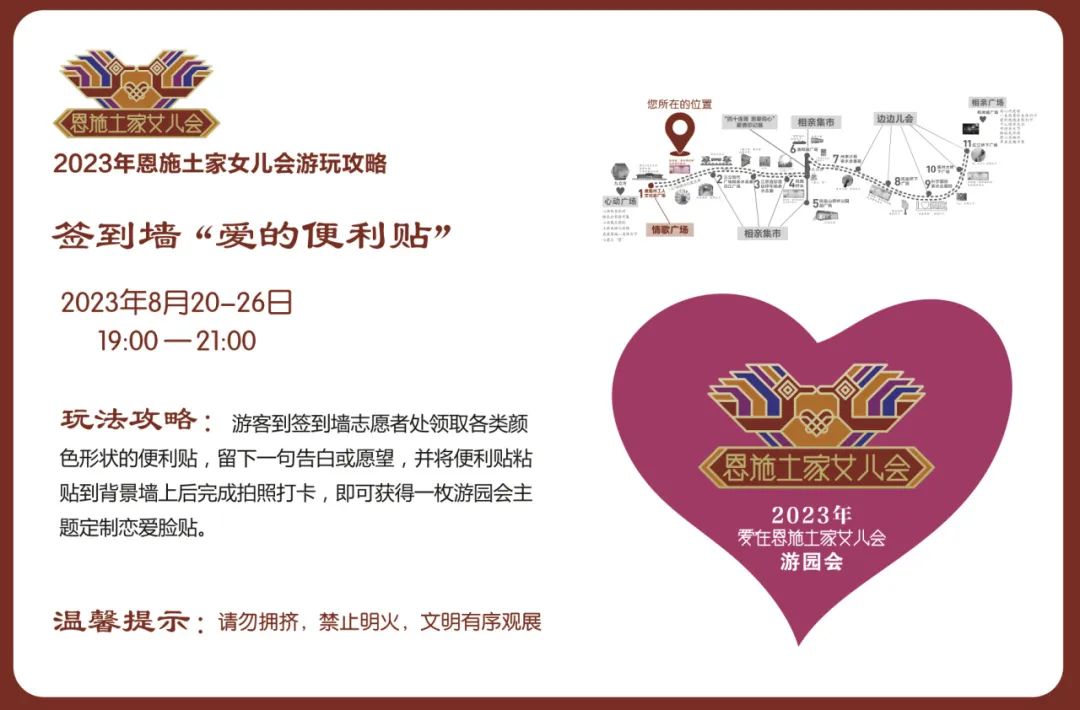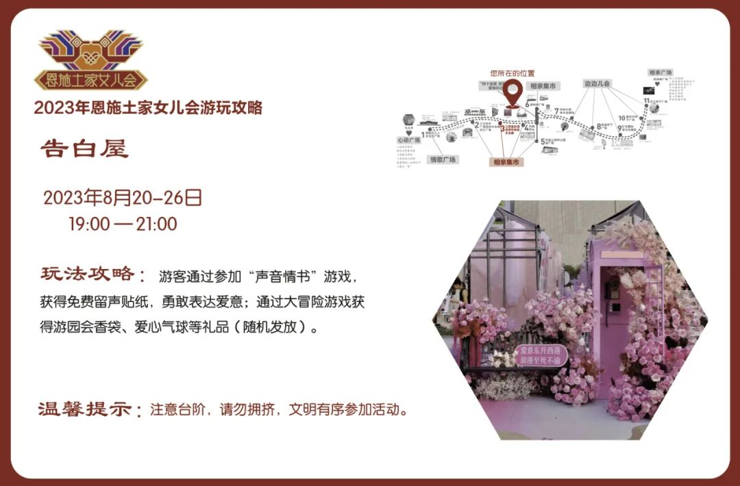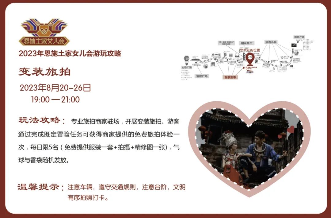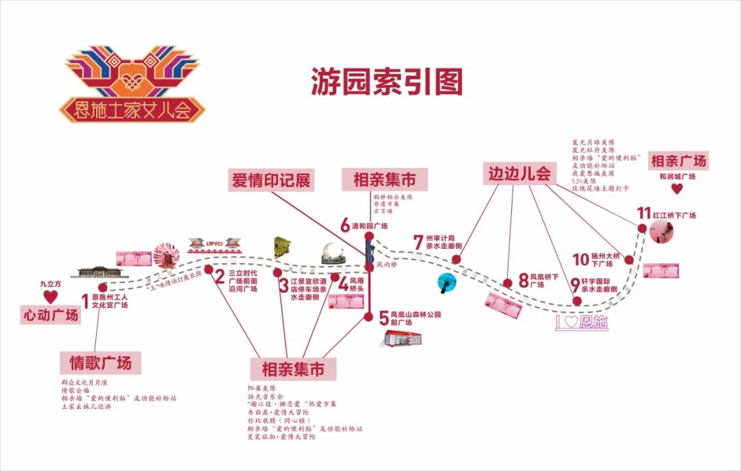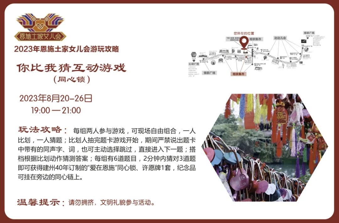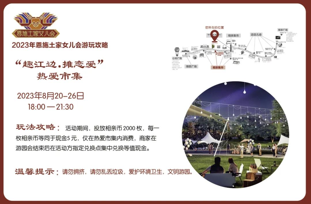 活動(dòng)內(nèi)容:恩施新銳市集商家和恩施非遺技藝傳承項(xiàng)目及傳承人,沿途擺攤設(shè)點(diǎn),設(shè)置同心鎖、愛(ài)情告白屋、幺妹兒巡游、愛(ài)情大冒險(xiǎn)等游玩項(xiàng)目,打造相親市集,并制作男女款相親幣,用于市集流通,體驗(yàn)“潮味”女兒會(huì)“趕場(chǎng)相親”。