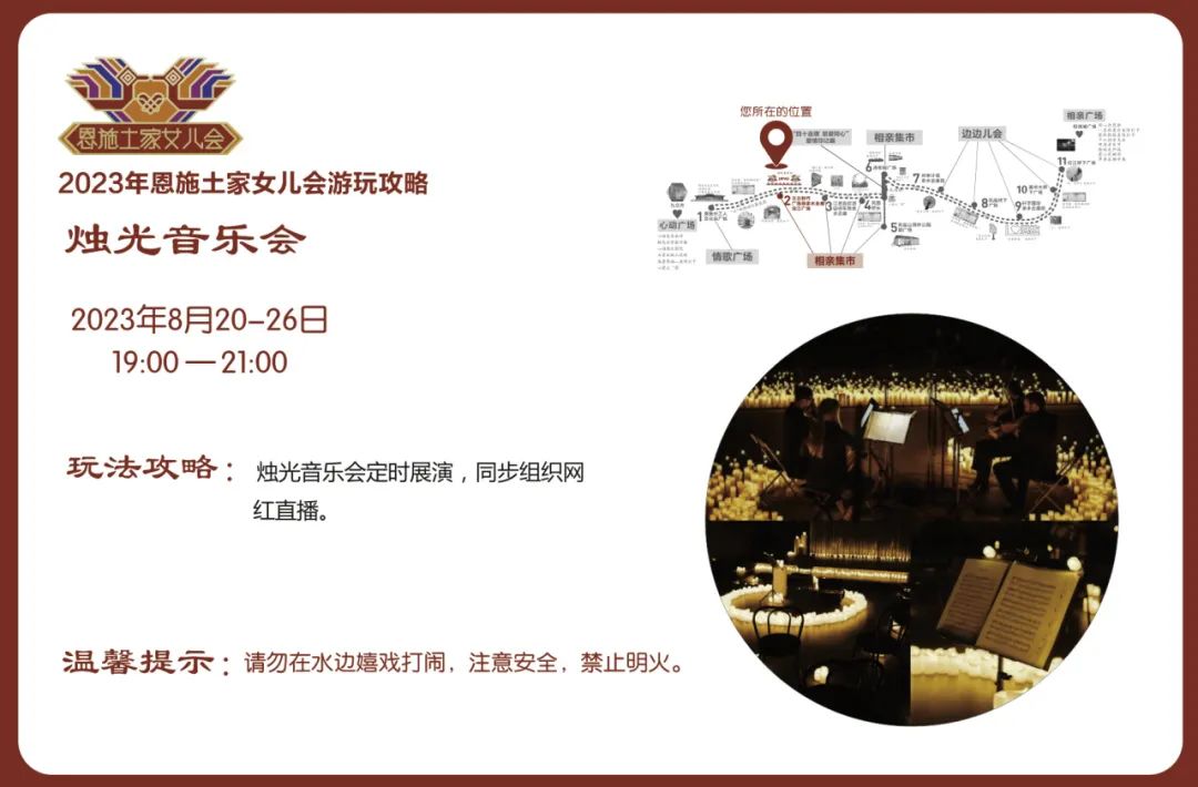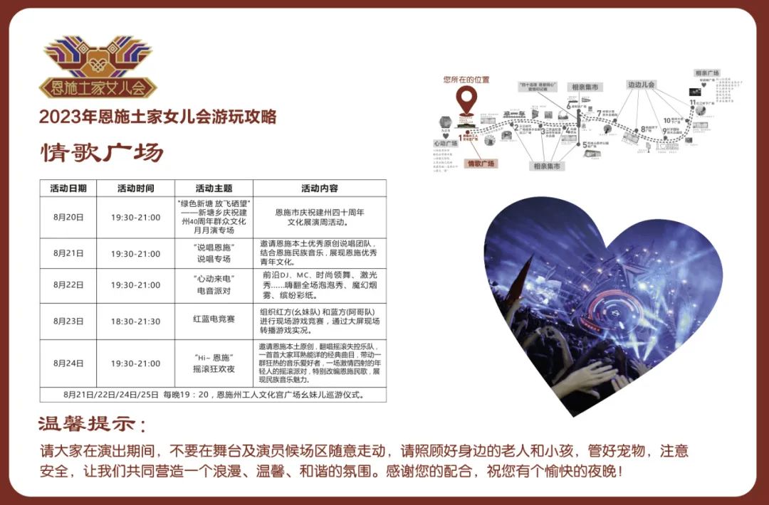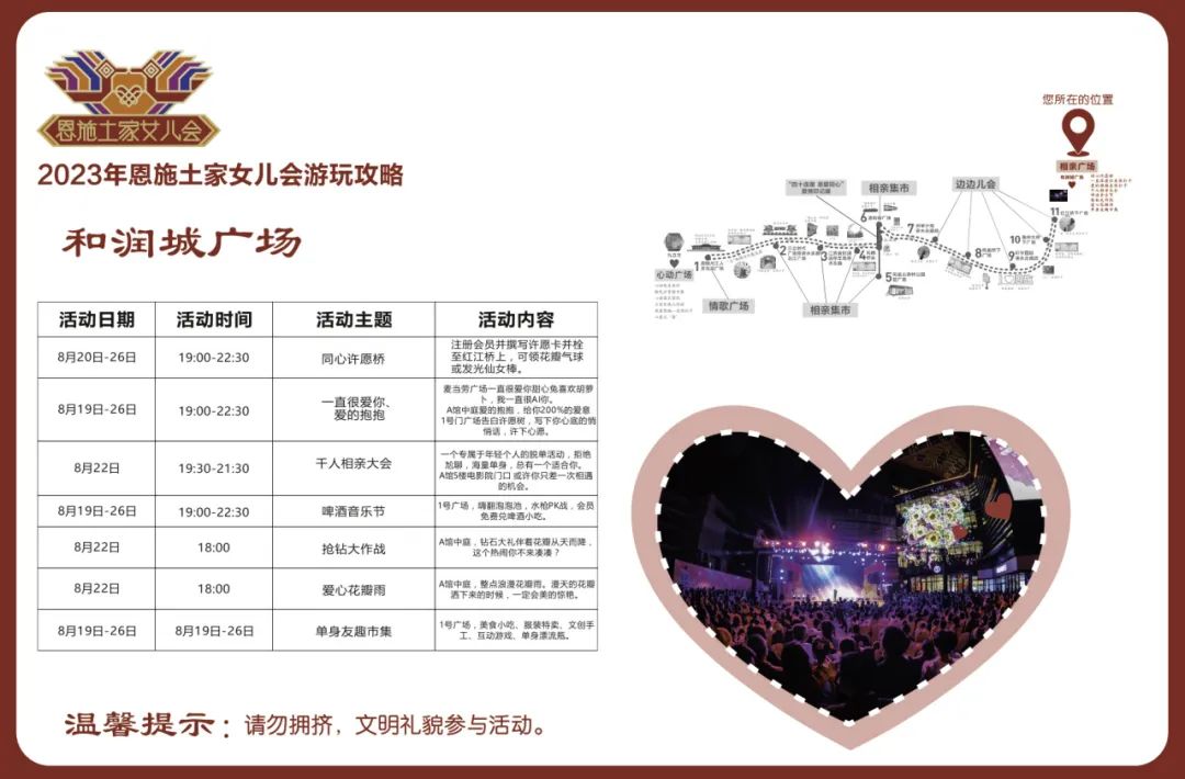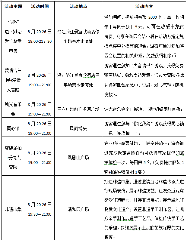 “群眾文化月月演”、“說(shuō)唱恩施”rap等文藝表演,電音派對(duì)、搖滾狂歡、幺妹兒巡游、同心鎖、愛(ài)情告白屋、愛(ài)情大冒險(xiǎn)、非遺市集、相親墻、燭光音樂(lè)會(huì)、愛(ài)情印記展