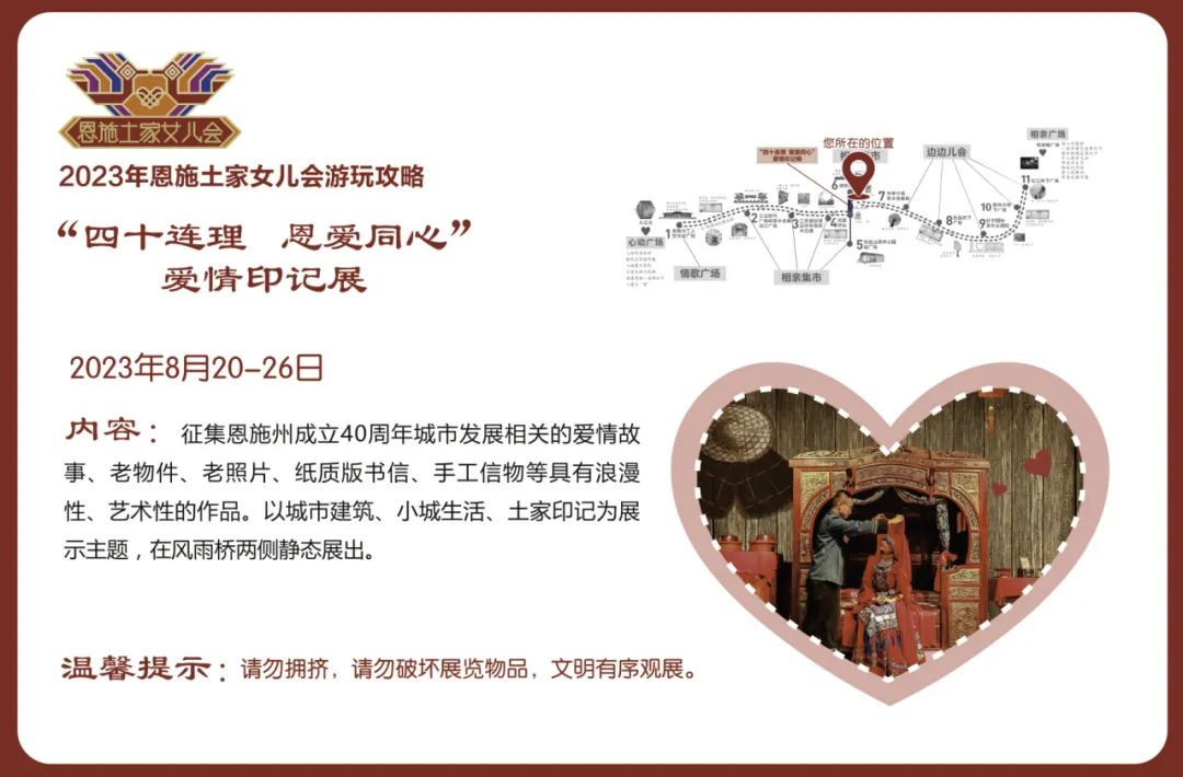 活動(dòng)內(nèi)容:恩施40年城市發(fā)展相關(guān)的愛(ài)情故事、老物件、老照片、紙質(zhì)版書(shū)信、手工信物等具有浪漫性、藝術(shù)性的作品。以城市建筑、小城生活、土家印記為展覽主題,在風(fēng)雨橋兩側(cè)靜態(tài)展出。