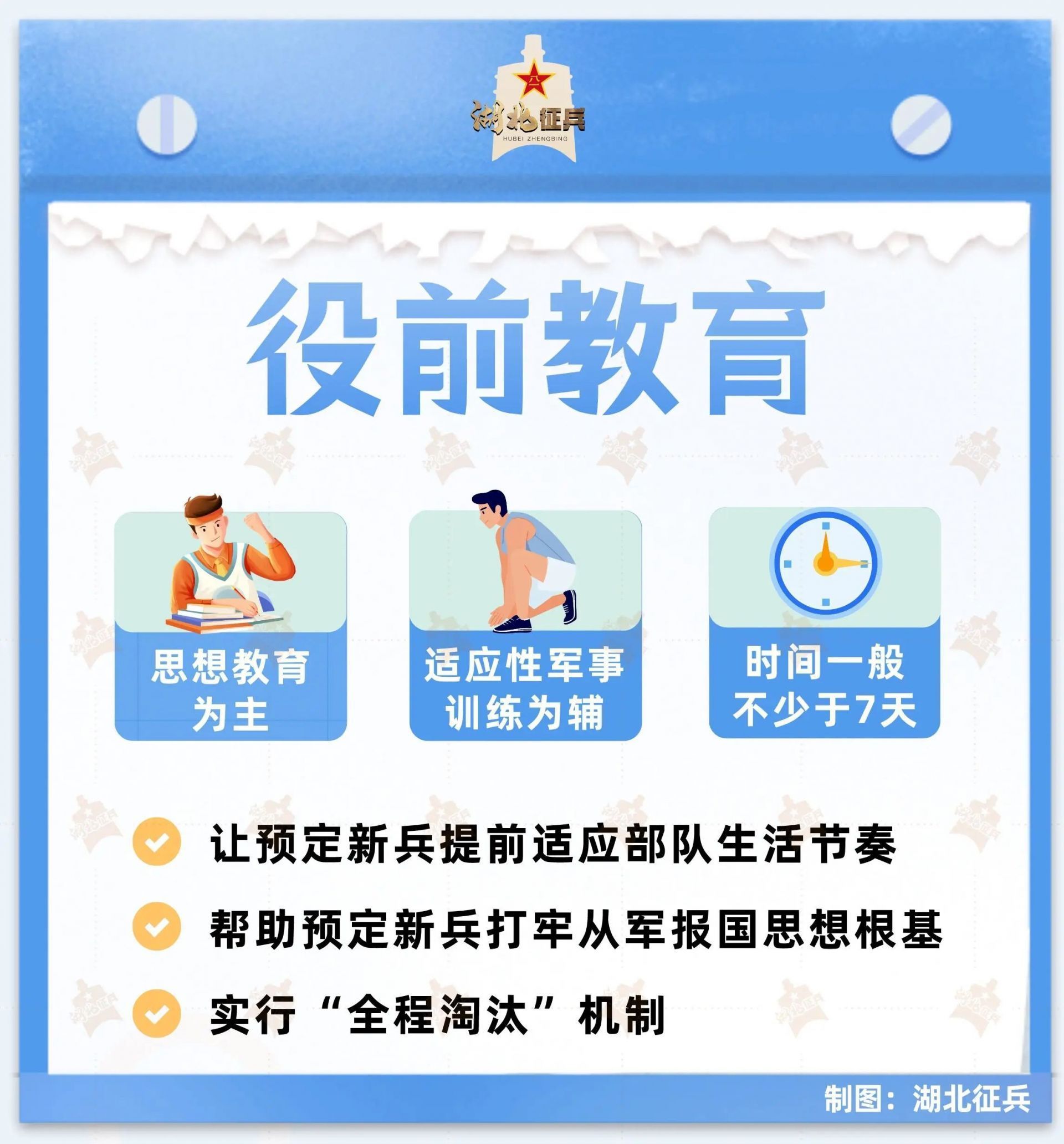 役前教育是指在預定新兵正式入伍前,由應征地兵役機關組織的思想政治教育和適應性訓練,時間一般不少于7天。
