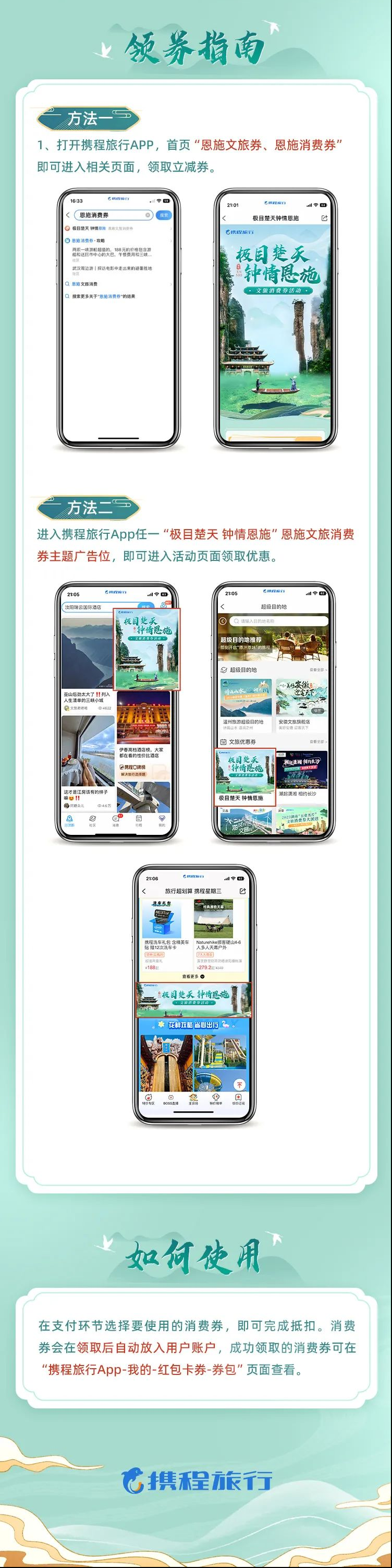 方法二:進入攜程旅行App任一“極目楚天 鐘情恩施”恩施文旅消費券主題廣告位,即可進入活動頁面領(lǐng)取消費券。