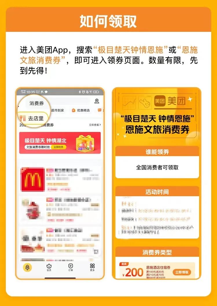 在美團和大眾點評App搜索“恩施文旅消費券”“恩施消費券”等關(guān)鍵詞,進入活動頁面領(lǐng)券。已領(lǐng)取的消費券可在“美團App-我的-紅包卡券-券包”或“大眾點評App-我的-錢包-現(xiàn)金券”內(nèi)查看,活動期間,消費券數(shù)量有限,領(lǐng)完即止。
