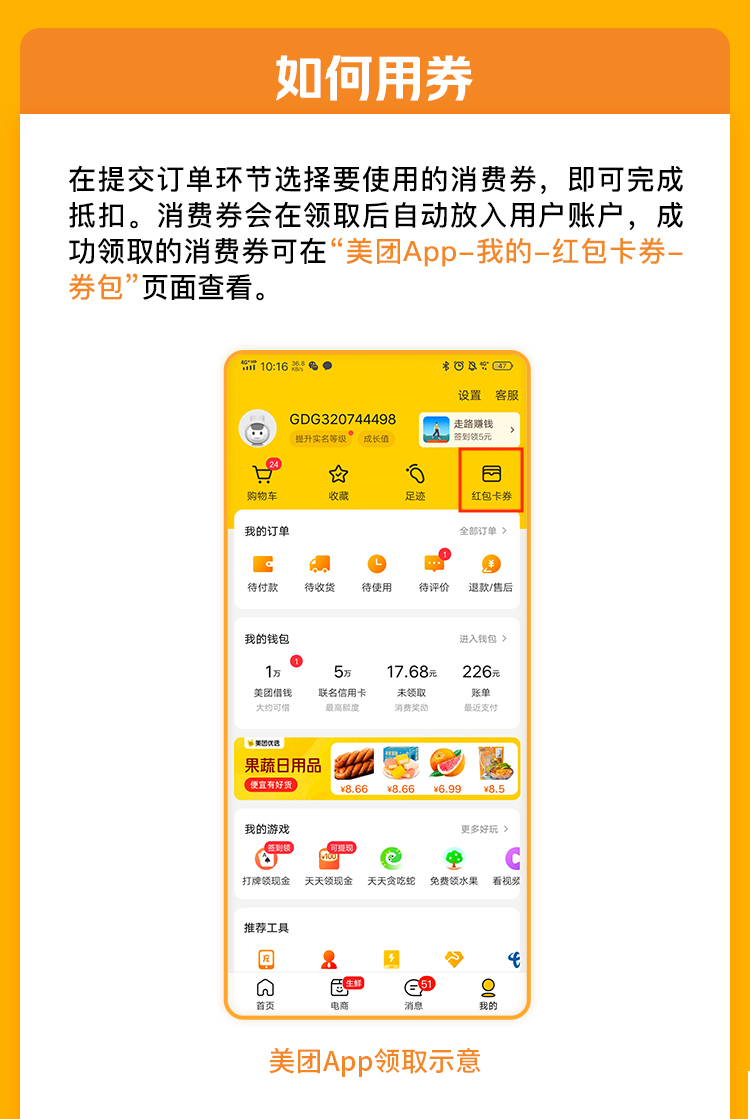 3.用券要求。消費者在下單購買或支付消費券使用范圍內(nèi)的產(chǎn)品和服務(wù)時,應(yīng)在享受平臺和商戶已有優(yōu)惠折扣后,于最后支付環(huán)節(jié)使用消費券。