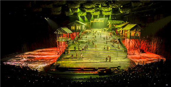 該劇用大膽、創(chuàng)新的藝術(shù)手法,讓更多的觀眾能夠沉浸在劇中,與英雄“對(duì)話(huà)”。據(jù)介紹,磁器口碼頭的舞臺(tái)搭建是用磚石砌成72個(gè)臺(tái)階,用約2000根柱子搭建起18米高的世界最大室內(nèi)吊腳樓建筑群,用160個(gè)獨(dú)立頂部懸吊電機(jī)組成燈光舞美裝置,用超20臺(tái)空中旋轉(zhuǎn)升降的燈光車(chē)來(lái)完成的……縱深的空間感,逼真的場(chǎng)景,完美再現(xiàn)40年代重慶城市風(fēng)貌。演藝空間與觀演空間交相穿插。觀眾與演出融為一體,經(jīng)歷一場(chǎng)身臨其境的獨(dú)特觀演體驗(yàn)。