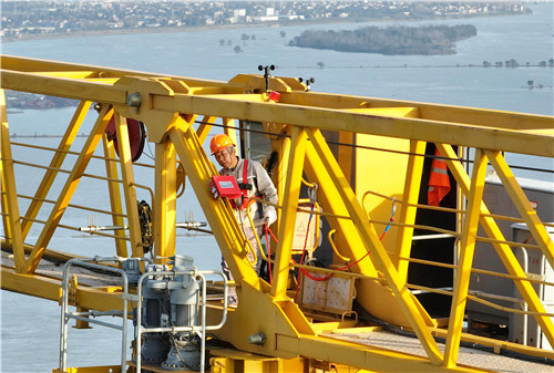 盡管冬日的陽光能帶來些許暖意,但在廣闊的江面上依然寒風(fēng)刺骨。百米高的塔吊在寒風(fēng)中微微晃動(dòng),令人忐忑心驚。檢驗(yàn)人員沒有絲毫猶豫,系好安全帶,全副武裝,沿著狹窄的鋼梯,往塔吊頂端攀爬……