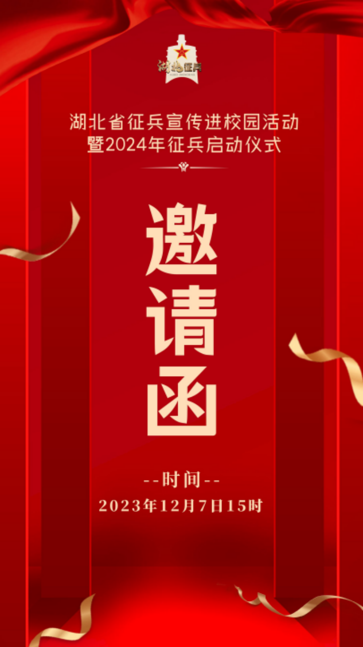 2023年12月7日15時(shí),由湖北省人民政府征兵辦公室主辦的“湖北省征兵宣傳進(jìn)校園活動(dòng)暨2024年征兵啟動(dòng)儀式”將正式舉辦。