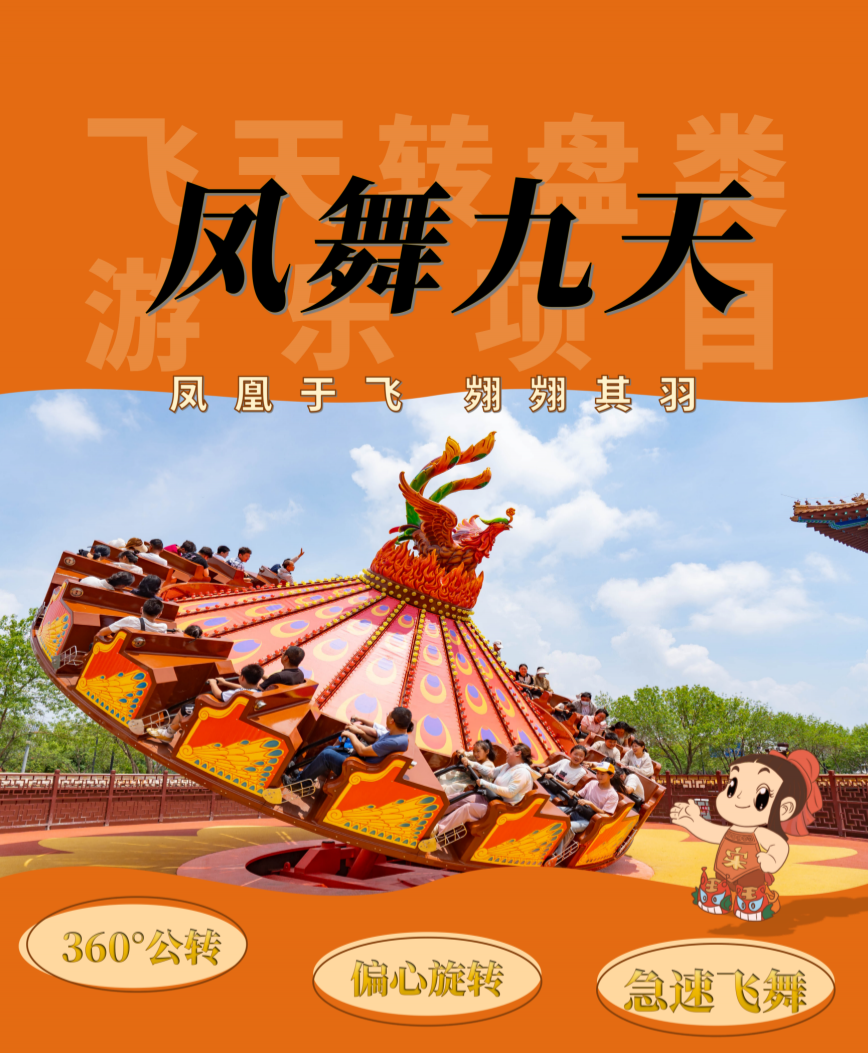 “鳳舞九天”游樂(lè)項(xiàng)目,不僅外觀精美,而且體驗(yàn)感極強(qiáng)!座艙在360°公轉(zhuǎn)的同時(shí)又有規(guī)律地偏心旋轉(zhuǎn),讓游客擁有如鳳凰飛翔般的非凡體驗(yàn)。