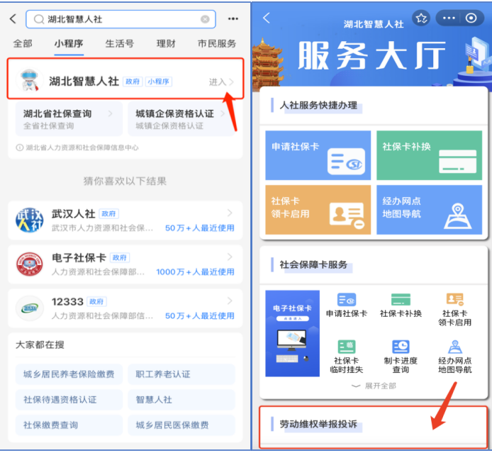 (二)勞動(dòng)者也可以通過(guò)微信搜索 “湖北12333”公眾號(hào),點(diǎn)擊“微服務(wù)”進(jìn)入“湖北12333服務(wù)大廳”,再點(diǎn)擊“勞動(dòng)維權(quán)舉報(bào)投訴”入口登錄;或支付寶搜索“湖北智慧人社”小程序,點(diǎn)擊“勞動(dòng)維權(quán)舉報(bào)投訴”入口登錄。