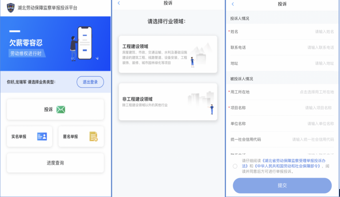 (一)舉報(bào)投訴登記。勞動(dòng)者可以點(diǎn)擊“投訴”“ 實(shí)名舉報(bào)”或“匿名舉報(bào)”,再按照行業(yè)領(lǐng)域選擇“工程建設(shè)領(lǐng)域”或“非工程建設(shè)領(lǐng)域”進(jìn)入業(yè)務(wù)辦理界面,填寫(xiě)投訴或舉報(bào)事由、訴求等相關(guān)信息,并上傳證據(jù)資料。