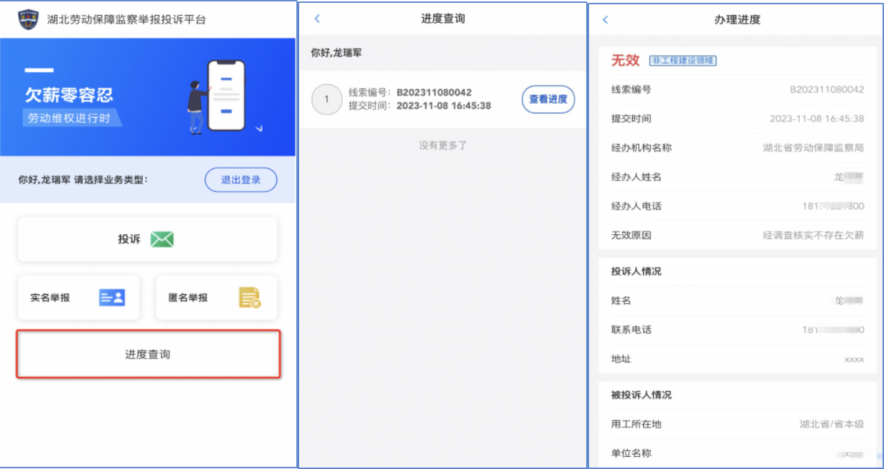 (二)進(jìn)度查詢辦理。在辦理過(guò)程中,勞動(dòng)者還可以通過(guò)上述方式訪問(wèn)登錄平臺(tái),點(diǎn)擊“進(jìn)度查詢”,再點(diǎn)擊“查看進(jìn)度”,實(shí)時(shí)查詢提交的舉報(bào)投訴記錄和辦理狀態(tài)。