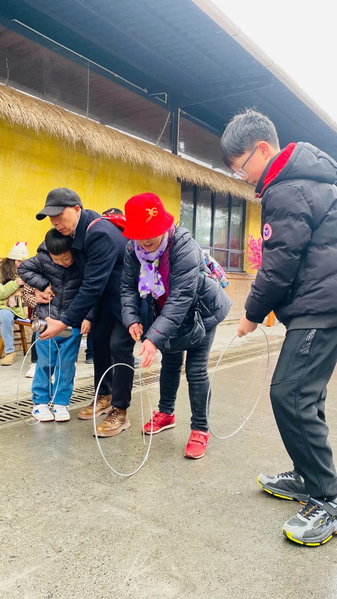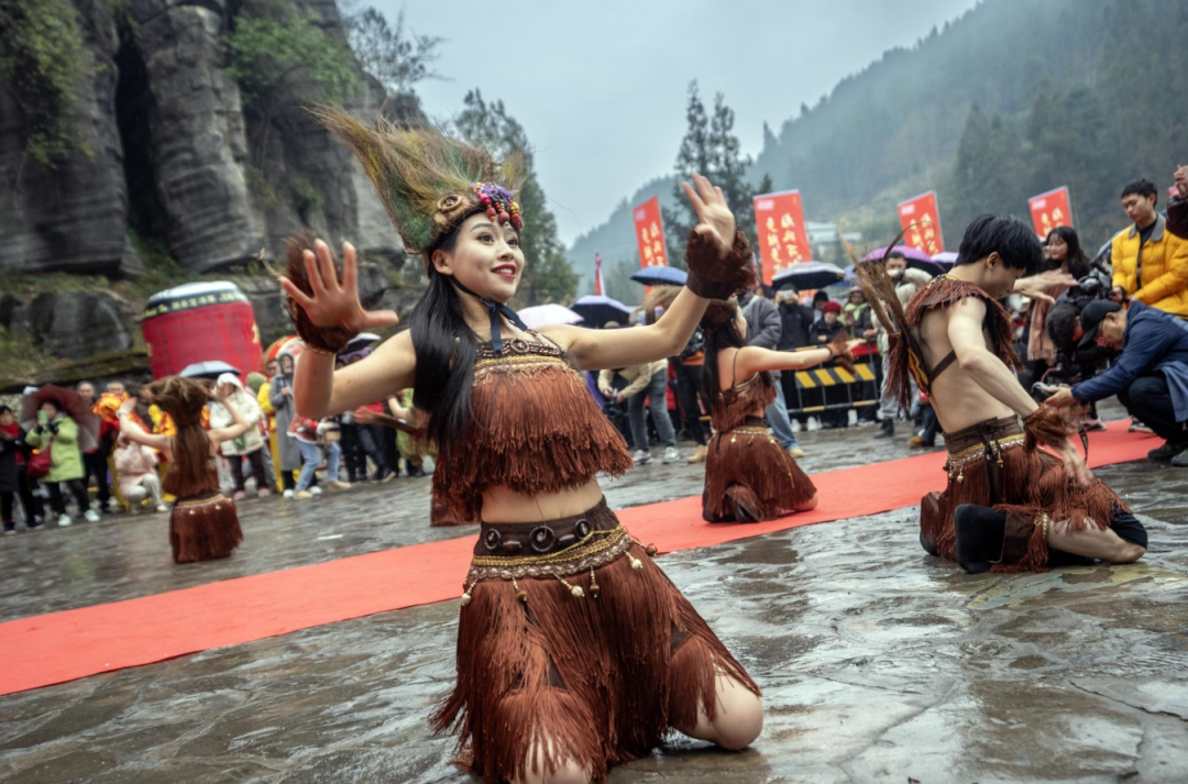 土家梯瑪(祭司)點燃了篝火,發(fā)放金穗,祈愿來年風(fēng)調(diào)雨順、年年有余。這熊熊篝火象征著新年的希望,現(xiàn)場的游客和村寨民眾一起感受著神秘的土家文化和年俗,共同祈福,共享民族大融合。