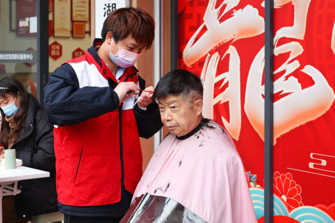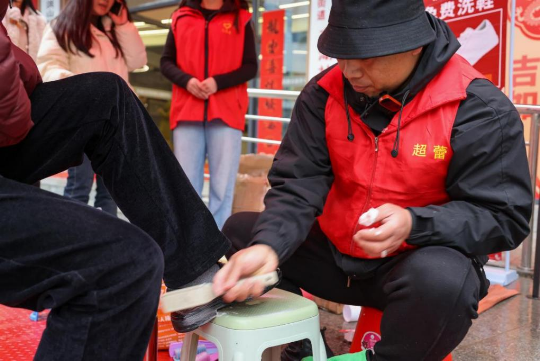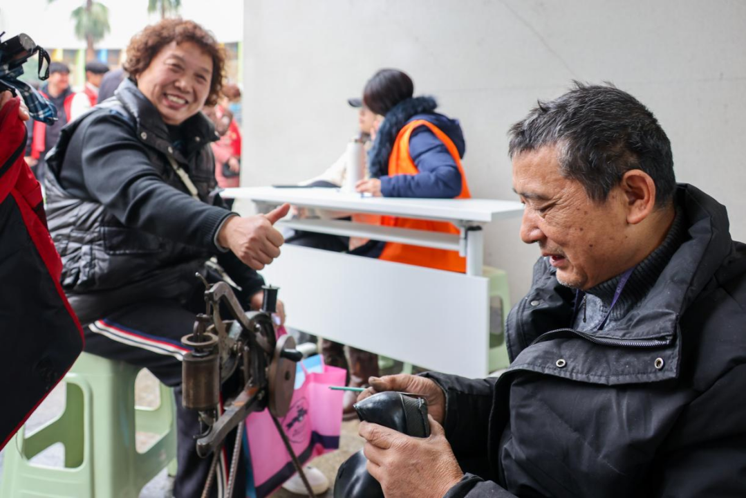 當(dāng)日清晨9點(diǎn),便民市集熱鬧開市。非遺手工藝捏泥人攤位大受歡迎,磨刀、理發(fā)、修鞋、修拉鏈、洗鞋等等便民服務(wù)點(diǎn)位更是人頭攢動,大學(xué)生志愿者團(tuán)隊(duì)參與其中,向老年朋友們介紹活動,指引大家有序參與。前來體驗(yàn)的老年朋友們,紛紛為這些貼心的安排豎起大拇指點(diǎn)贊。
