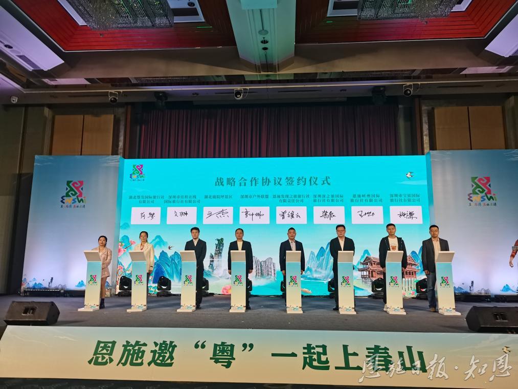 廣州推介會上,恩施梭布埡石林景區(qū)、恩施問月旅行社、恩施見路旅行社分別與廣州康輝旅行社、港中旅(廣東)旅行社、目的地定制旅行聯(lián)盟簽訂合作協(xié)議。深圳推介會上,恩施鹿院坪景區(qū)、湖北鄂發(fā)國旅、恩施峽州國旅、恩施發(fā)現(xiàn)之旅分別與深圳市戶外聯(lián)盟、深圳市佳程在線國旅、深圳市寶旅國旅、深圳深之旅國旅簽訂合作協(xié)議。