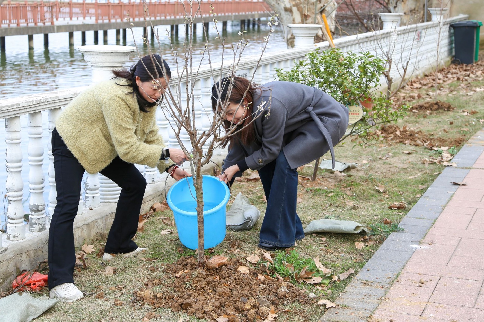 和煦的微風里,剛栽下的櫻桃樹亭亭玉立,冬棗樹和李子樹的枝椏恣意舒展,如同環(huán)保意識在大家心中深深扎根,也寄寓著師徒之間的深厚情誼。