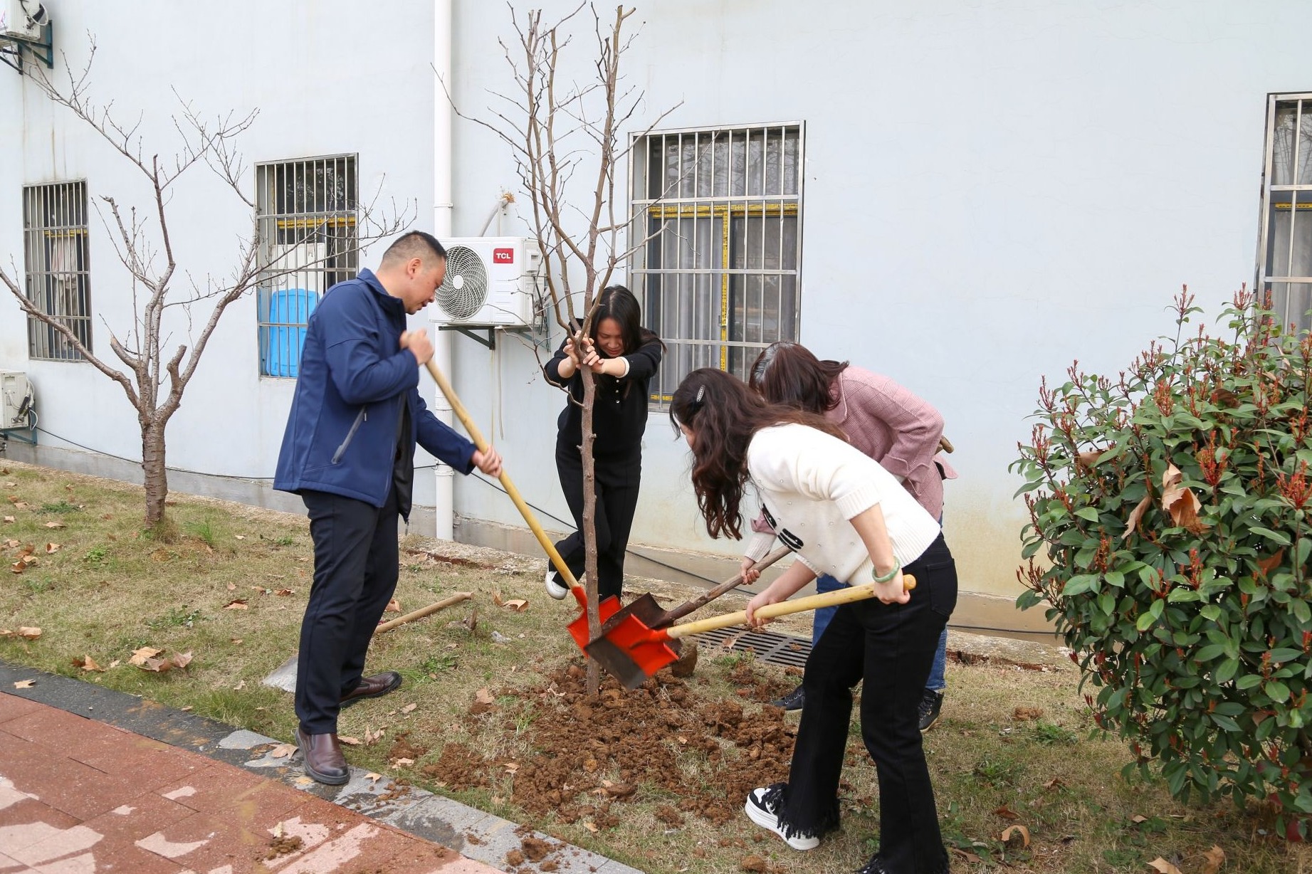 植樹地點選在單位后院花園,活動規(guī)模不大,但現(xiàn)場氣氛很活躍。大家笑意盎然,揮鋤培新土,施肥育根基,澆水潤新枝。經(jīng)過半小時的精心栽種,六棵樹苗傲然挺立在草坪上,為花園增添了一抹欣欣向榮的綠意。