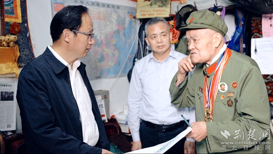 當(dāng)天上午,黃石市委宣傳部副部長、市委網(wǎng)信辦主任萬金光,黃石市退役軍人事務(wù)局黨組書記、局長陳鵬圖一行參加啟動(dòng)儀式,并前往抗美援朝老戰(zhàn)士瞿介昌住處看望。他們向瞿介昌老戰(zhàn)士簡單介紹了本次主題報(bào)道情況,向這位老英雄獻(xiàn)上了鮮花,表達(dá)了對退役軍人的敬意,并為“致敬英雄”采訪團(tuán)授旗。