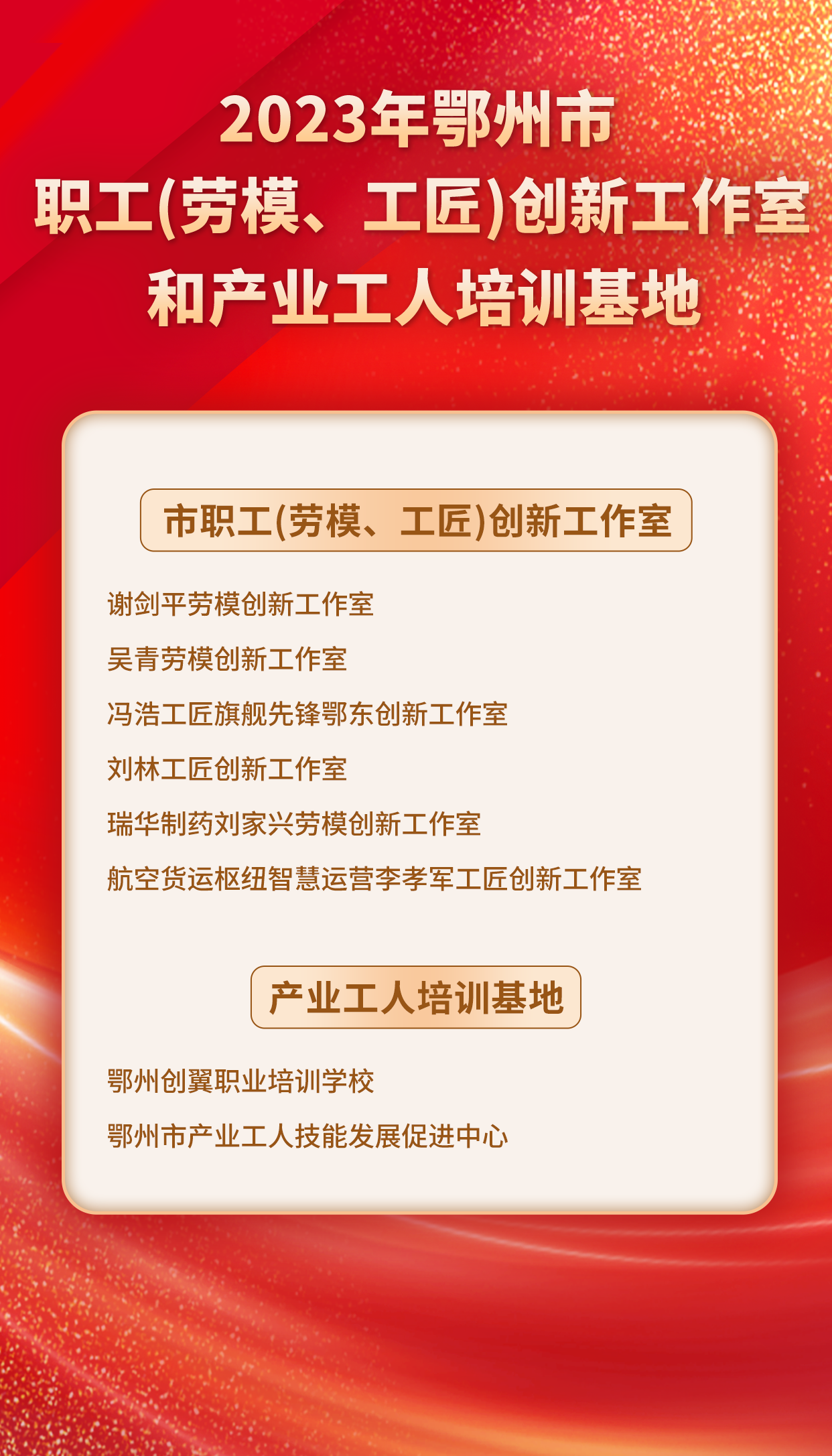 4月22日上午,在2024年鄂州市雙“百千萬”勞動(dòng)和技能競(jìng)賽啟動(dòng)式上,鄂州公布2023年全市“六級(jí)體系”勞動(dòng)競(jìng)賽先進(jìn)集體及先進(jìn)個(gè)人名單,并公布2023年鄂州市職工(勞模、工匠)創(chuàng)新工作室和產(chǎn)業(yè)工人培訓(xùn)基地。