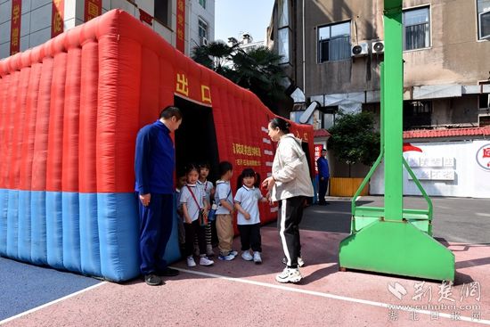 在操場,消防員指導(dǎo)小朋友試穿“滅火戰(zhàn)斗服”、佩戴消防頭盔、體驗火場逃生帳篷,詳細(xì)講解火災(zāi)事故的危險性以及如何正確撥打火警電話、火場逃生自救方法等消防安全知識,讓小朋友們對火災(zāi)有了更深刻地認(rèn)識。