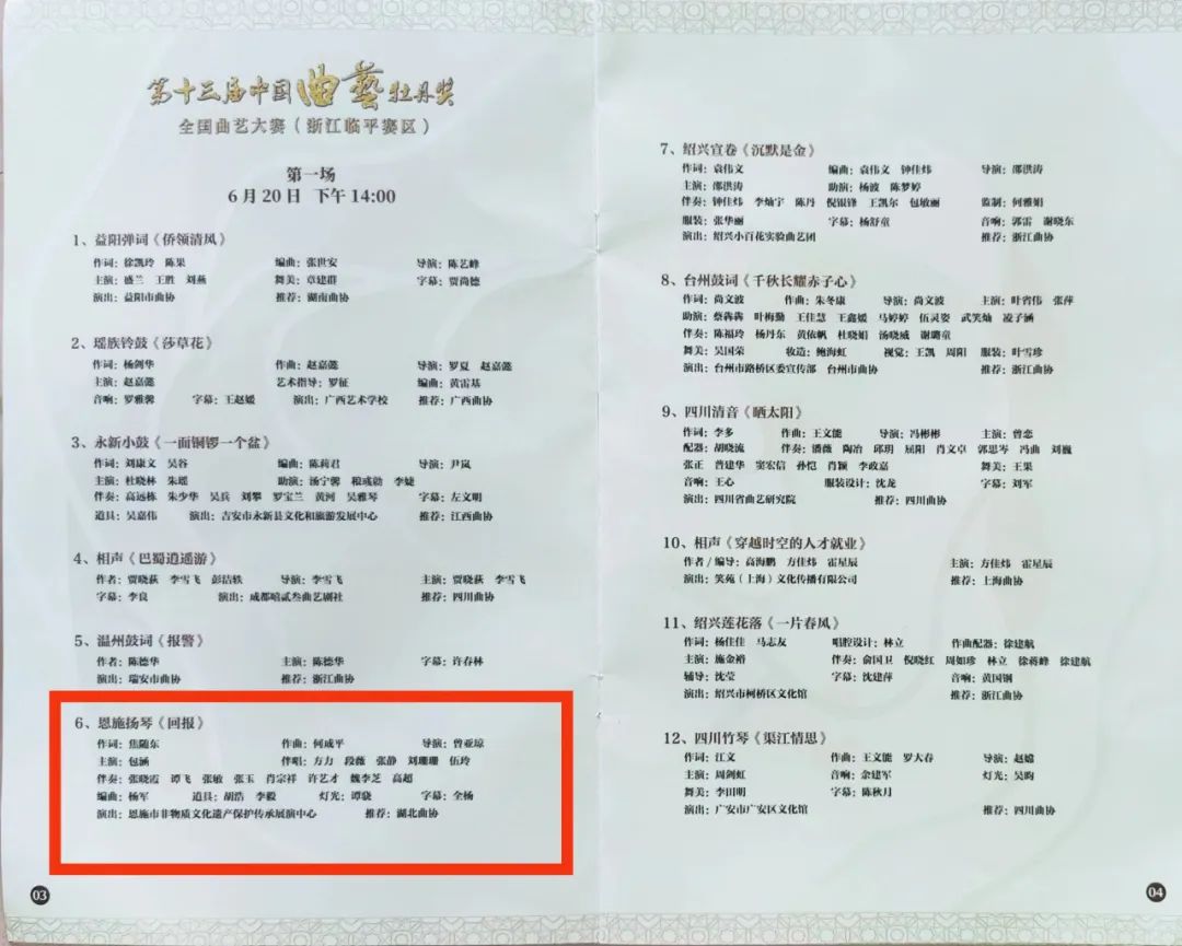 本次入圍的恩施揚琴《回報》由湖北省曲藝家協(xié)會選送,恩施市非遺保護傳承展演中心創(chuàng)作、表演,決賽現(xiàn)場與來自廣西、江西、四川、上海、浙江等全國各地的46個曲藝類節(jié)目同臺競技,現(xiàn)場名家云集,精品薈萃,共同呈現(xiàn)了一場精彩紛呈的曲藝盛宴。