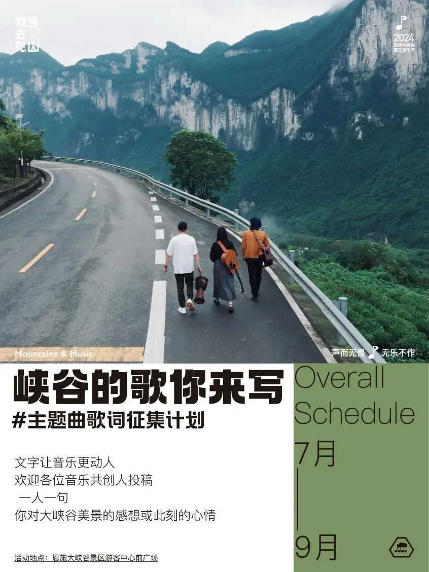 7月開始,2024恩施大峽谷夏日音樂季主題“我自去見山”——“音樂云朵打卡座椅”、“峽谷的歌你來寫”等互動活動,已落座大峽谷各個角落,將音樂元素、旅途互動、潮流藝術(shù)融入大峽谷獨(dú)有的自然和人文特質(zhì)之中,創(chuàng)造出獨(dú)一無二的旅途記憶,為大家呈現(xiàn)一段向山而行的美學(xué)時空。