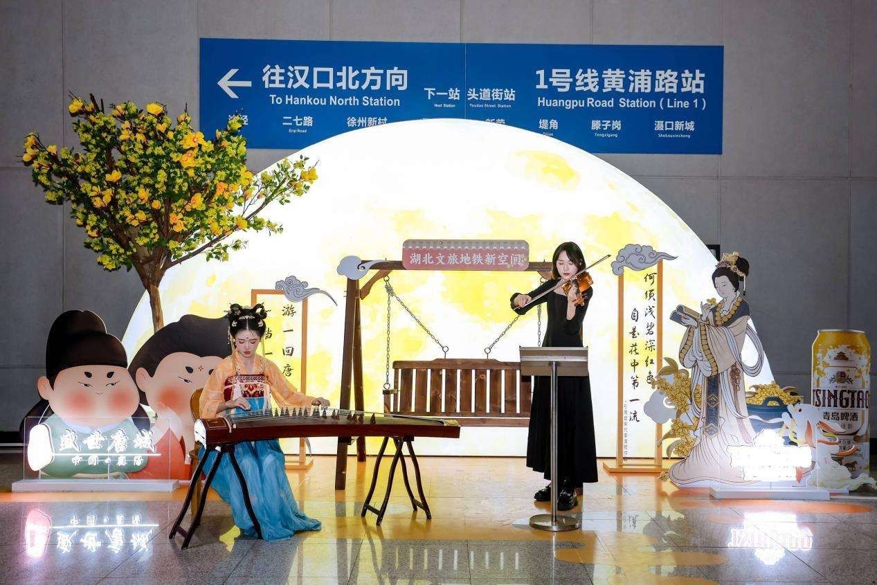 金秋九月,武漢地鐵站內(nèi)一場(chǎng)跨越千年的文化對(duì)話正在上演。悠揚(yáng)的古箏音符與婉轉(zhuǎn)的小提琴旋律在空中交織,《月亮代表我的心》的樂(lè)聲回蕩在現(xiàn)代化的地鐵站內(nèi),為往來(lái)匆忙的乘客們帶來(lái)了一場(chǎng)沉浸式的地鐵“賞月”之旅,引得現(xiàn)場(chǎng)游客陣陣歡呼。