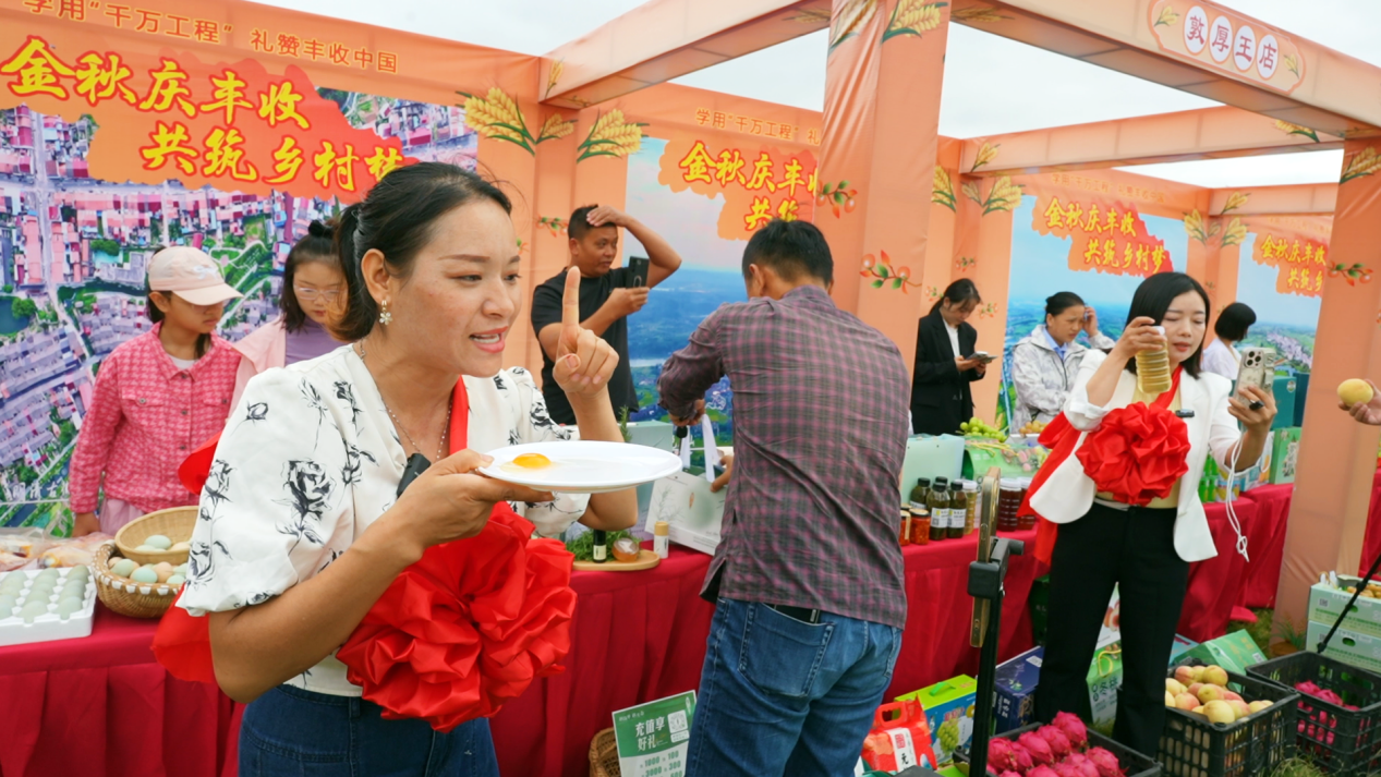 “豐收節(jié)活動是一次很好的產(chǎn)品展示機會,我們今天帶來了土鵝、土雞蛋、土雞、紅泥咸鴨蛋、獼猴桃等。其中這個土雞蛋是我自己家散養(yǎng)的土雞下的蛋,我煮了一些現(xiàn)場可以品嘗,都非常受大家歡迎?!毙⒉h“雞蛋姐”王素美說。