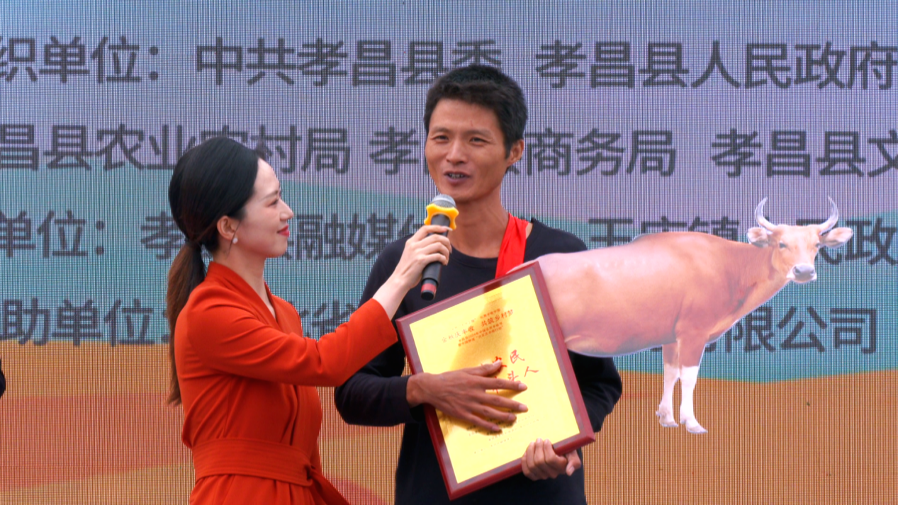 “它來了,它來了,他牽著牛羊走來了……”作為本次活動的重頭戲之一,“新時代農(nóng)民致富帶頭人”的頒獎十分搶眼,一等獎獲得者直接牽走了一頭牛,二等獎帶走了一只羊,三等獎拉走了一筐大鵝,現(xiàn)場“農(nóng)”味十足、熱鬧歡騰,大家沉浸在熱鬧的豐收節(jié)氛圍之中。