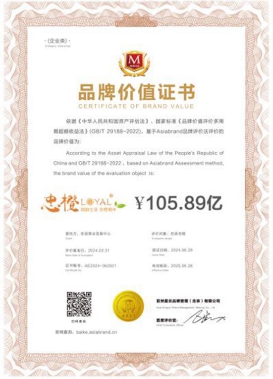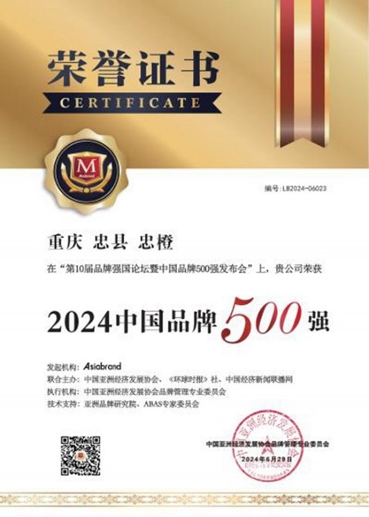 目前,“忠縣柑橘”已獲國家質(zhì)檢總局地理標志保護認證,今年6月,第10屆品牌強國論壇在北京舉行。會上,忠縣忠橙憑借卓越品質(zhì)與品牌影響力,獲得“2024中國品牌500強”“2024中國(橙類行業(yè))十大領(lǐng)軍品牌”兩項榮譽,其品牌價值躍升至105.89億元,標志著忠縣忠橙品牌建設(shè)取得歷史性突破。