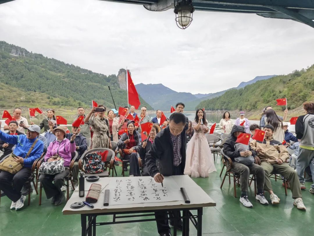 “國(guó)慶紅船游,共賞盛世景”——恩施大清江紅花峰林景區(qū)、景區(qū)游船開展關(guān)于山河錦繡,國(guó)富民強(qiáng)書法創(chuàng)作及歌唱祖國(guó)、共慶華誕主題活動(dòng)。在游覽大好河山的同時(shí)感受祖國(guó)的繁榮昌盛。
