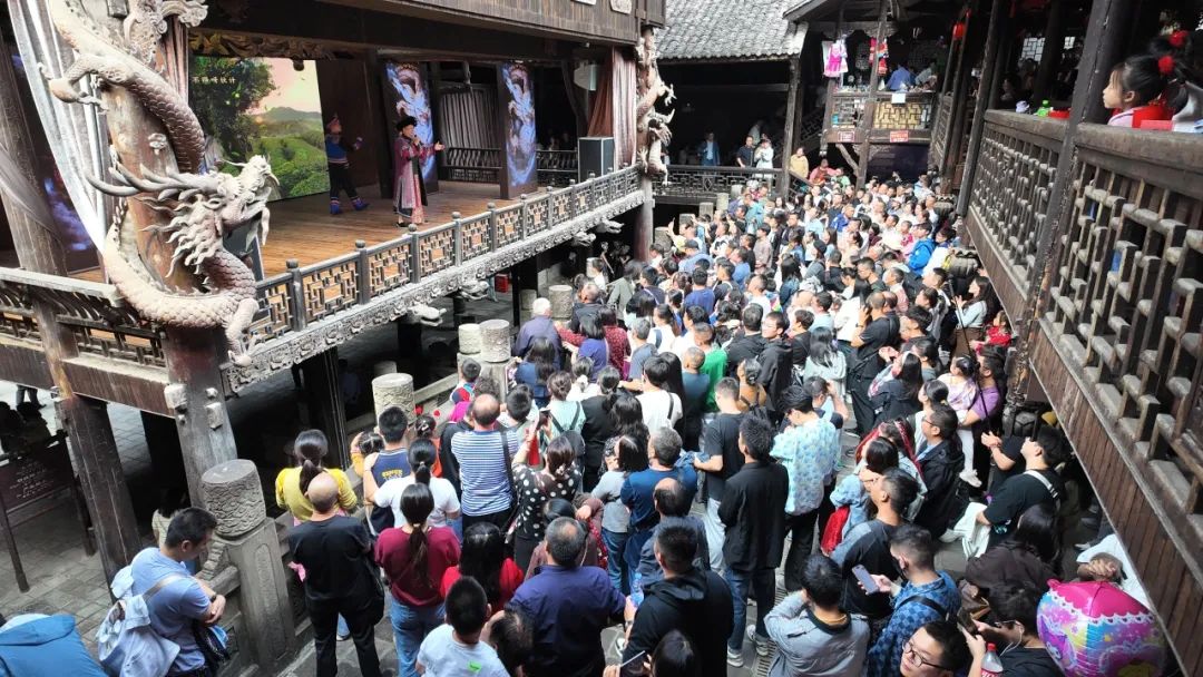 土司城景區(qū)內(nèi),鮮艷的五星紅旗為這個(gè)假期帶來(lái)了滿滿的儀式感。一曲敬酒歌,表達(dá)恩施人的熱情;一臺(tái)極具民族特色的演出,讓游客在古色古香的建筑中了解土司文化的精髓。
