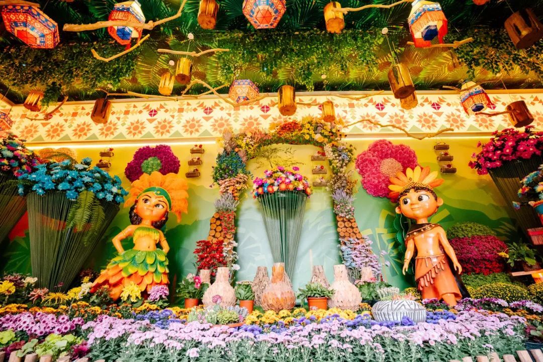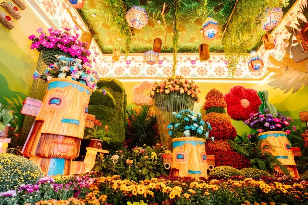 美洲館中異國(guó)菊花品種與南美洲文化的巨人石像、熱帶蜂鳥(niǎo)、巴西嘉年華IP、波利尼西亞人等元素相融合,展示了南美洲文化的獨(dú)特魅力,并通過(guò)菊花花展的形式向游客展示南美洲的藝術(shù)、美學(xué)和生活方式。