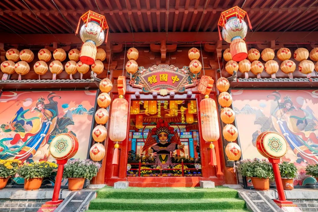 中國(guó)館以中國(guó)傳統(tǒng)曲藝為設(shè)計(jì)理念,以中國(guó)傳統(tǒng)戲臺(tái)為背景,擺放大量的精品菊花帶,中間身穿戲服的穆桂英與兩側(cè)演奏古典樂(lè)器的女子都采用乒乓菊扦插技術(shù)。曲藝與自然式花帶相結(jié)合,展現(xiàn)出一種神秘而美妙的意境,吸引游客沉浸其中,感受古代藝術(shù)與自然之美的交融。